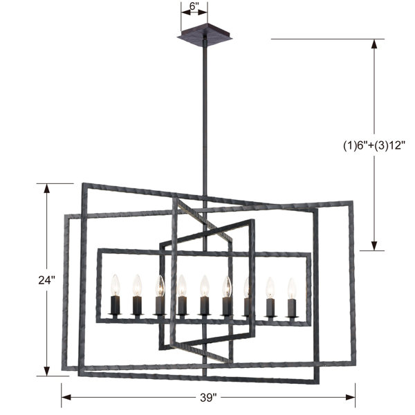 Geometric industrial iron overlaps and intertwines in the urban Riviere collection. The chandelier features clean lines showcasing a minimalistic design yet are a dramatic statement. The raw steel is artfully finished with a hammered pattern to enhance the cool eclectic design. While industrial, the fixtures can accompany a variety of home design to add a bit of edge.
