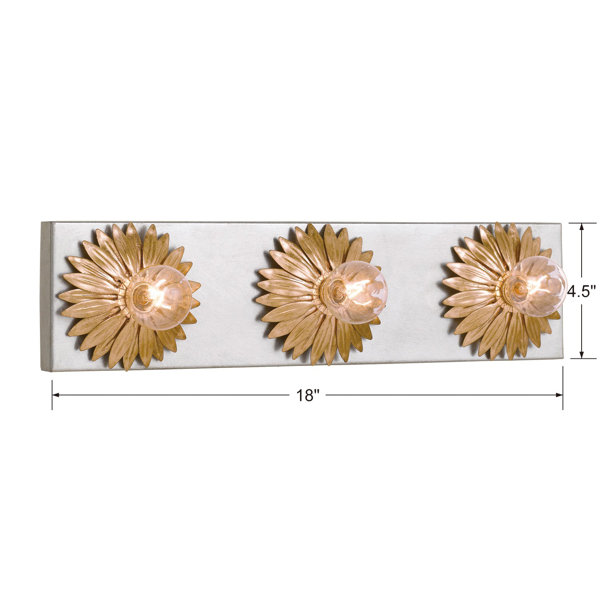 This 3-light bath bar illuminates your bathroom while giving an inviting flea-market-find vibe to your space. Layers of shapely stainless steel leaves are finished in antique gold, making them pop out from the weathered white backplate. At the center of each of these leaf bunches is a socket that holds a 60W max bulb, sold separately and compatible with dimmer switches. Rated for damp-locations, this vanity light is also safe to install and use in high-moisture environments.