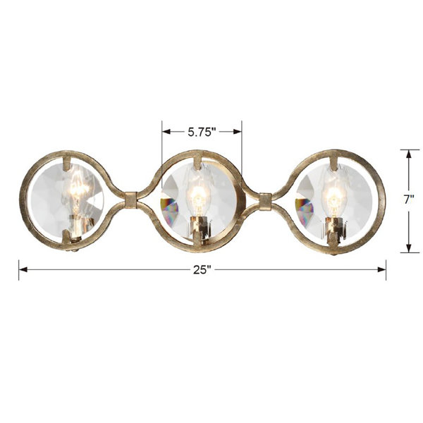 Warmth emanates from faceted cut crystal jewels framed in curved distressed metal. There is opulence in this midcentury design of this 3-Light Vanity Light which brings any room together.