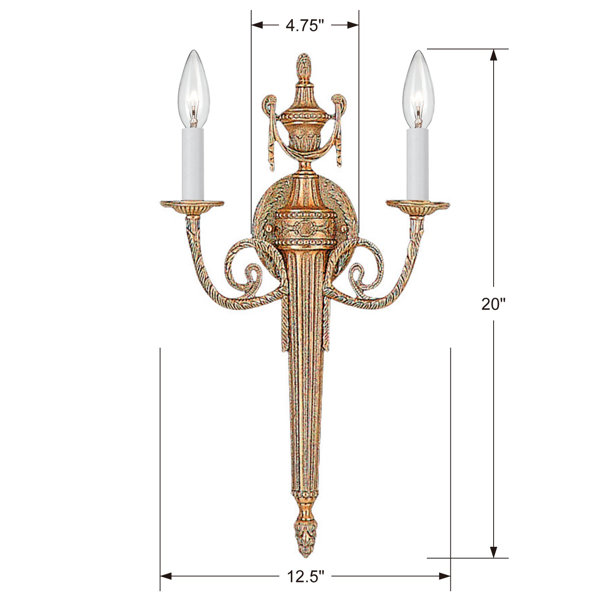 This candle wall light brings a timeless elegance to your living room or hallway. Crafted from stainless steel, it features scrolled arms, carved detailing, and draped accents with a weathered brass finish for a French country look. This fixture showcases a classic look with its two candelabra bases, each supporting a 60W bulb (sold separately) that casts an upward glow to brighten up your space. We love that this piece is rated for damp locations, so it works well in your main bathroom or guest bath.