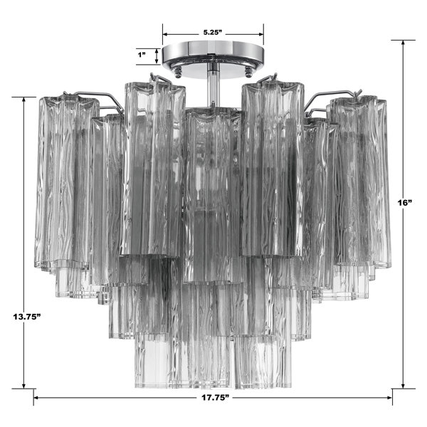 The captivating Dalores Lighting Collection is a modern-day interpretation of the iconic mid-century Tronchi chandelier. Inspired by its predecessor's sleek lines and geometric shapes, the Dalores features a polished Chrome or Aged Brass metal frame that exudes sophistication and style. Its unique design showcases transparent tiers of textured Tronchi glass tubes, forming a mesmerizing 5-point rounded star shape. Choose from a range of glass colors, including clear, amber, smoke, and white, or the stunning Autumn option, which features a captivating multicolor disposition of amber, clear, and smoke Tronchi glass. The Dalores Lighting Collection offers various sizes and finishes, allowing you to find the perfect fit for your space while adding a touch of timeless elegance.