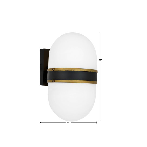 This outdoor wall lantern has a durable design that's safe to use in areas with direct water exposure, so it's a great choice for any outdoor area that could use a little extra illumination. It has an egg-shaped design with an opal frosted white glass globe shade A matte black and textured gold band adds visual intrigue in the center, plus contrast against the stark look of the glass. Inside this fixture, it accommodates a single medium-base bulb of up to 60W (sold separately). Best of all, it's compatible with dimmer switches, so you can set the mood for every occasion as you welcome your guests.