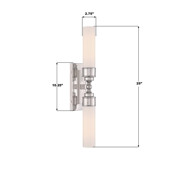 The Maesie collection includes a white cylindrical glass shade and a rectangular back plate with stepped detailing. It is damp-listed for safe use in moisture-prone areas. The collection offers a single light option, suitable for mounting on either side of a mirror, and a double light option, perfect for placing over a vanity. This elegant fixture adds a sophisticated touch to bathroom spaces.