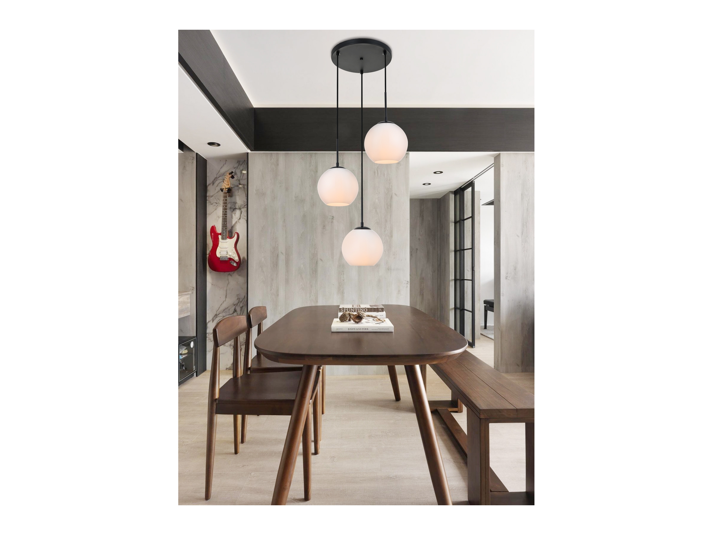 Refined style with a practical design Baxter hanging pendant lamps bring cosmopolitan sophistication anywhere especially to an entryway office bathroom bedroom or kitchen. The smooth iron frame features a disk-shaped canopy and comes in a brass finish. Adjustable black cords allow you to modify the hanging height from 14 to 87 inches. Three identical frosted white spherical glass shades are suspended at varying heights and remain open at the center to allow for effortless replacement of the filament-style bulbs (not included). Living in the big city has never been this easy.