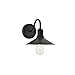 - Black finish wall sconce with a curved arm and cone shaped shade
