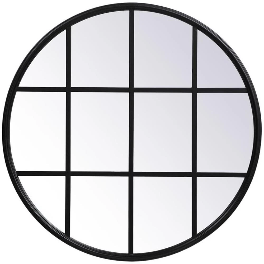 Elegant Decor Motif 28" Round Mid Century Metal Windowpane Frame Mirror in Black