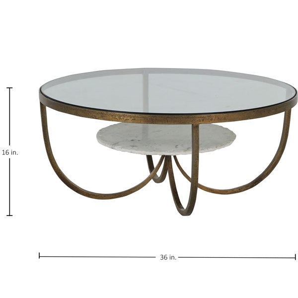The Wilbur Coffee Table is aperfectly sized piece featuring a circle of tempered glass supported by a metal base with three gently curved legs. A marble shelf with a raw edge adds additional surface space, combining functionality with elegance. Perfect for living rooms, this coffee table adds a touch of sophistication with its luxurious materials and refined design. The combination of glass and marble creates a modern yet timeless aesthetic that enhances any decor.