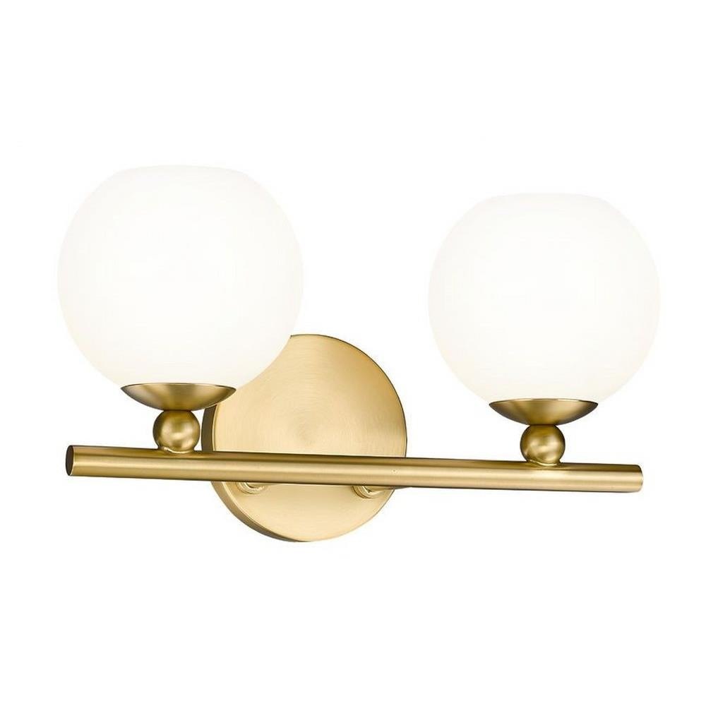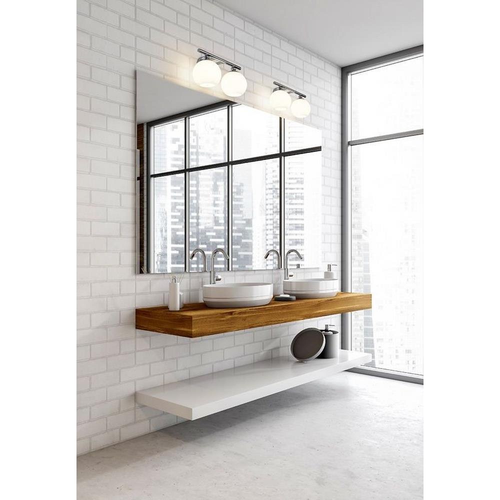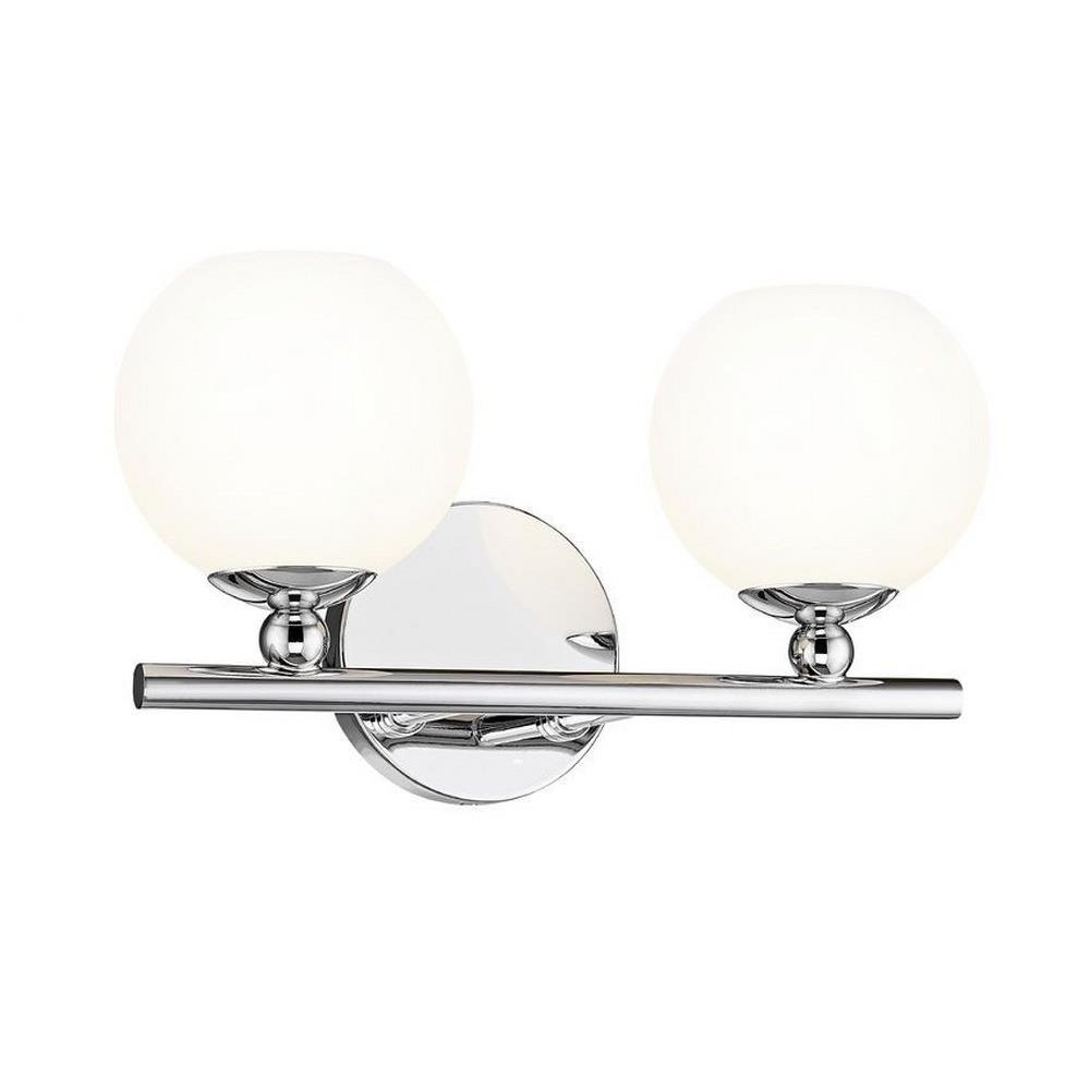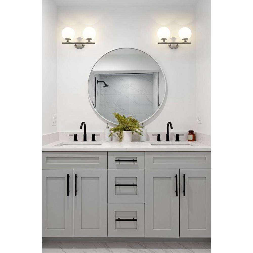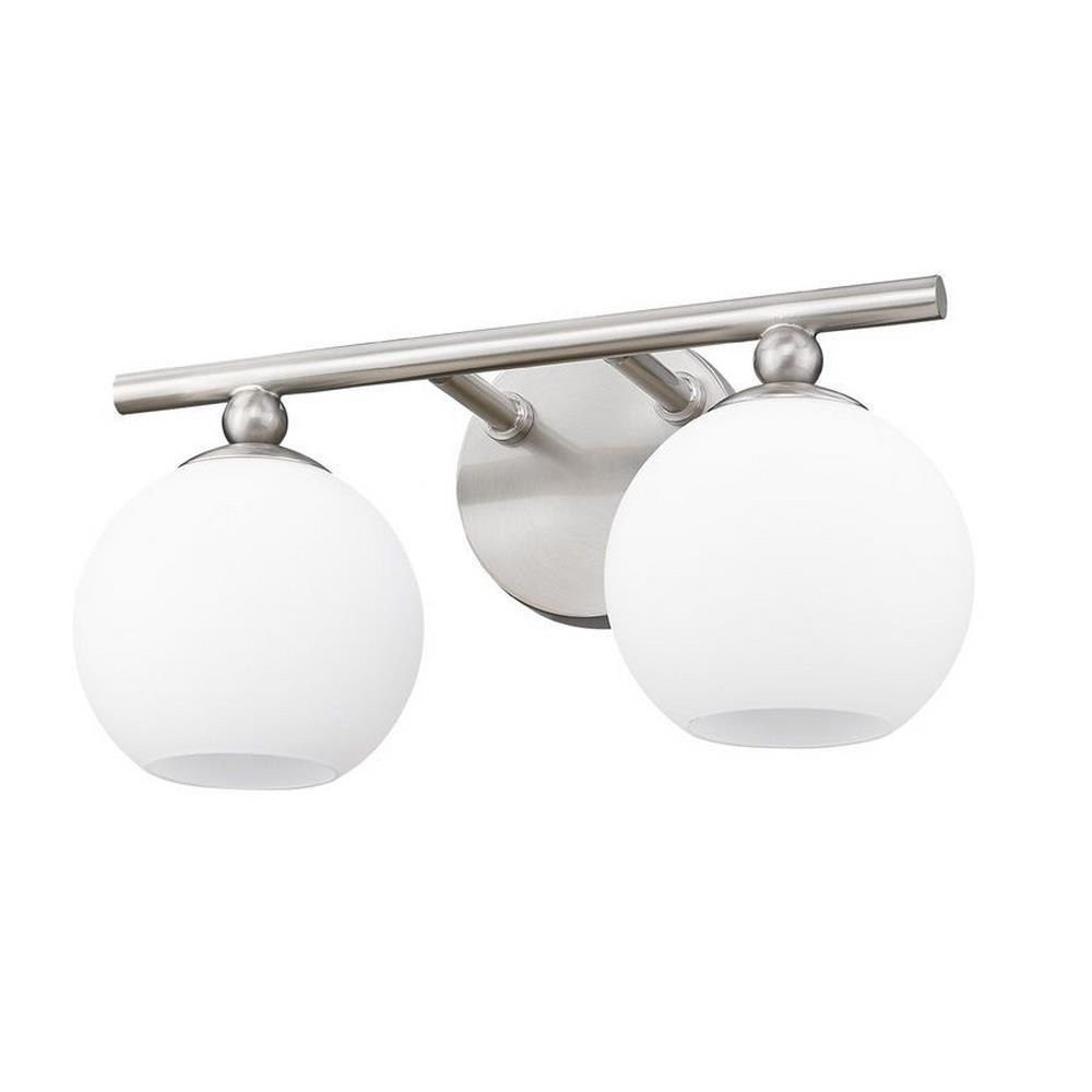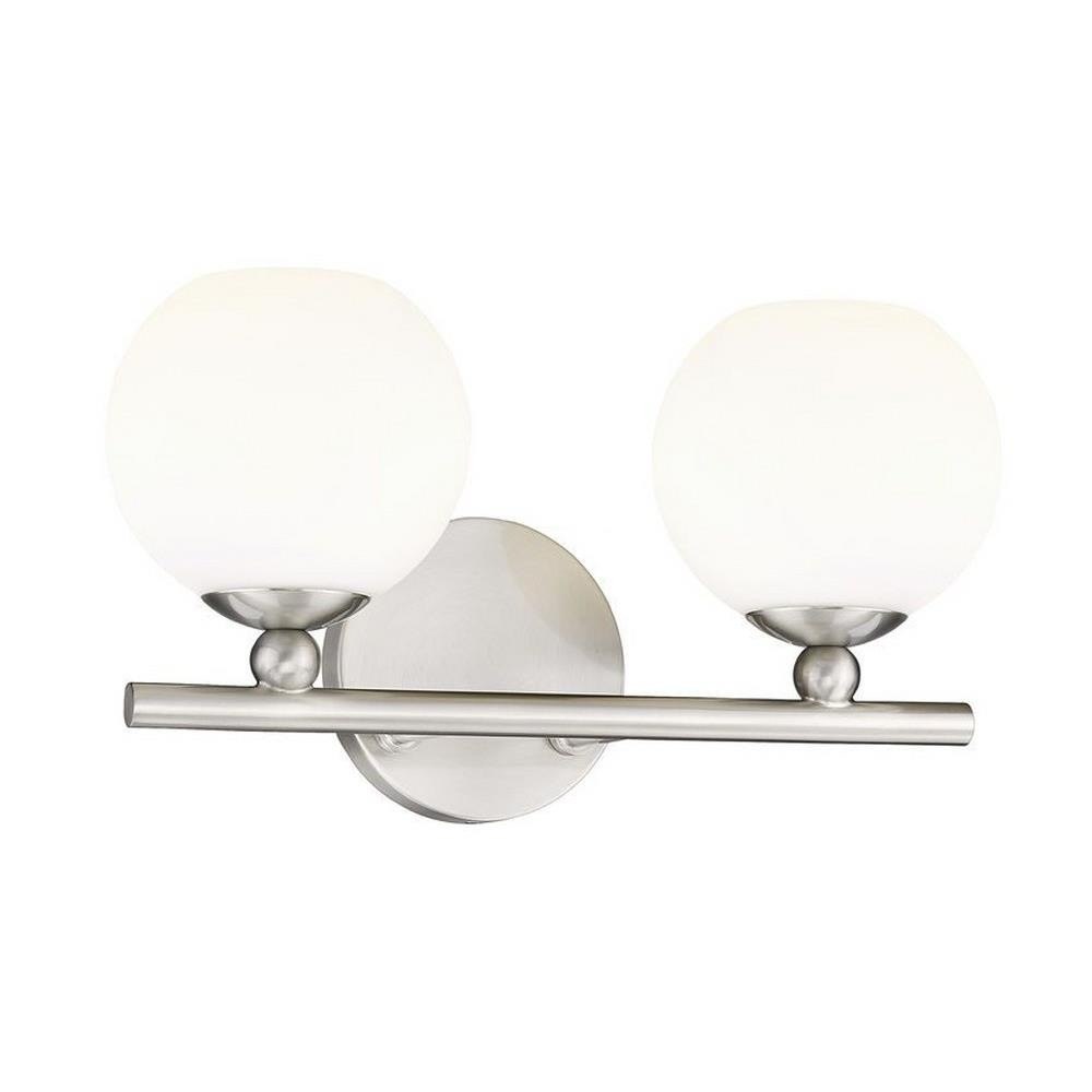 Make modern style work in an updated bath space with this two-light vanity light from the Neoma collection. Symmetry and a hint of festive retro influence blend to add an outspoken design aesthetic featuring side-by-side opal etched glass globe shades affixed to a minimalist frame made of brushed nickel finish steel. This contemporary vanity light transforms a master ensuite or guest bath into a haven for style.