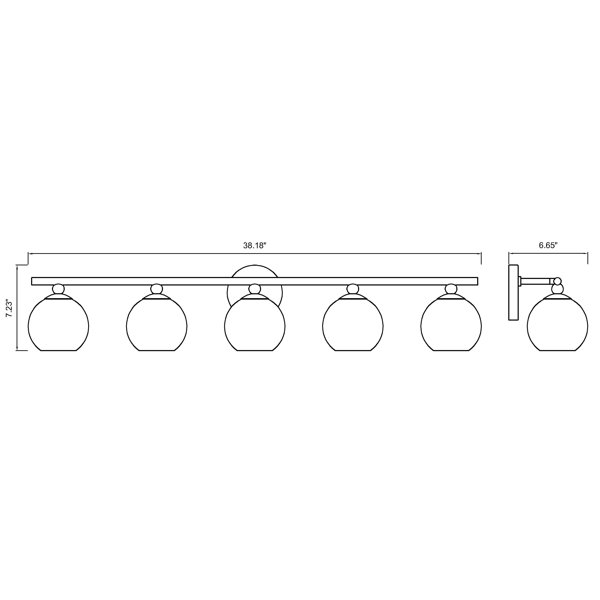 This 5-light vanity fixture outfits your bathroom with a bold, sophisticated look and plenty of modern coastal style. Crafted from steel with a dynamic finish of your choice, it includes a circular backplate and a horizontal bar that supports five holders. Each one keeps in place an opal-etched glass globe shade that surrounds a 100W max bulb, sold separately and compatible with a dimmer switch. This vanity light is also damp-rated, making it safe to install and use in high-moisture environments.