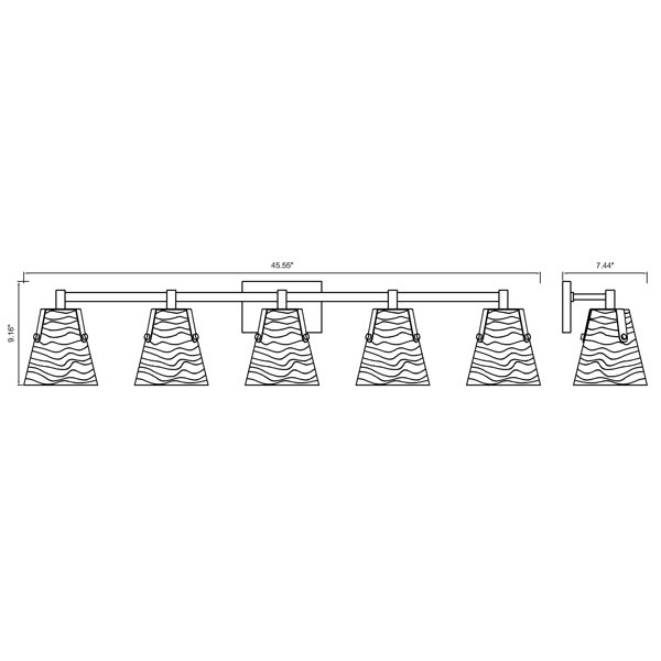 This 5-light vanity fixture embellishes your bathroom with a bold, sophisticated look and plenty of modern style. Crafted from steel with a dynamic finish of your choice, it includes a rectangular backplate and a horizontal bar that supports five holders. Each one keeps in place a cone shade made from clear ribbed glass that reminds us of waves. Nestled inside are 100W max bulbs, sold separately and compatible with a dimmer switch. This vanity light is also damp-rated, making it safe to install and use in high-moisture environments.