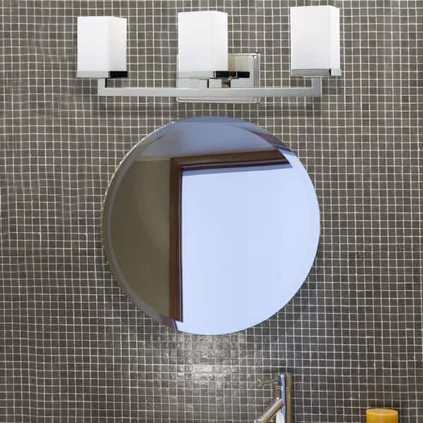 This three-light vanity fixture provides a clean modern look with its use of rectangular matte opal shades and chrome geometric inspired hardware. This fixture can either be hung up or down, depending on the user's needs.
