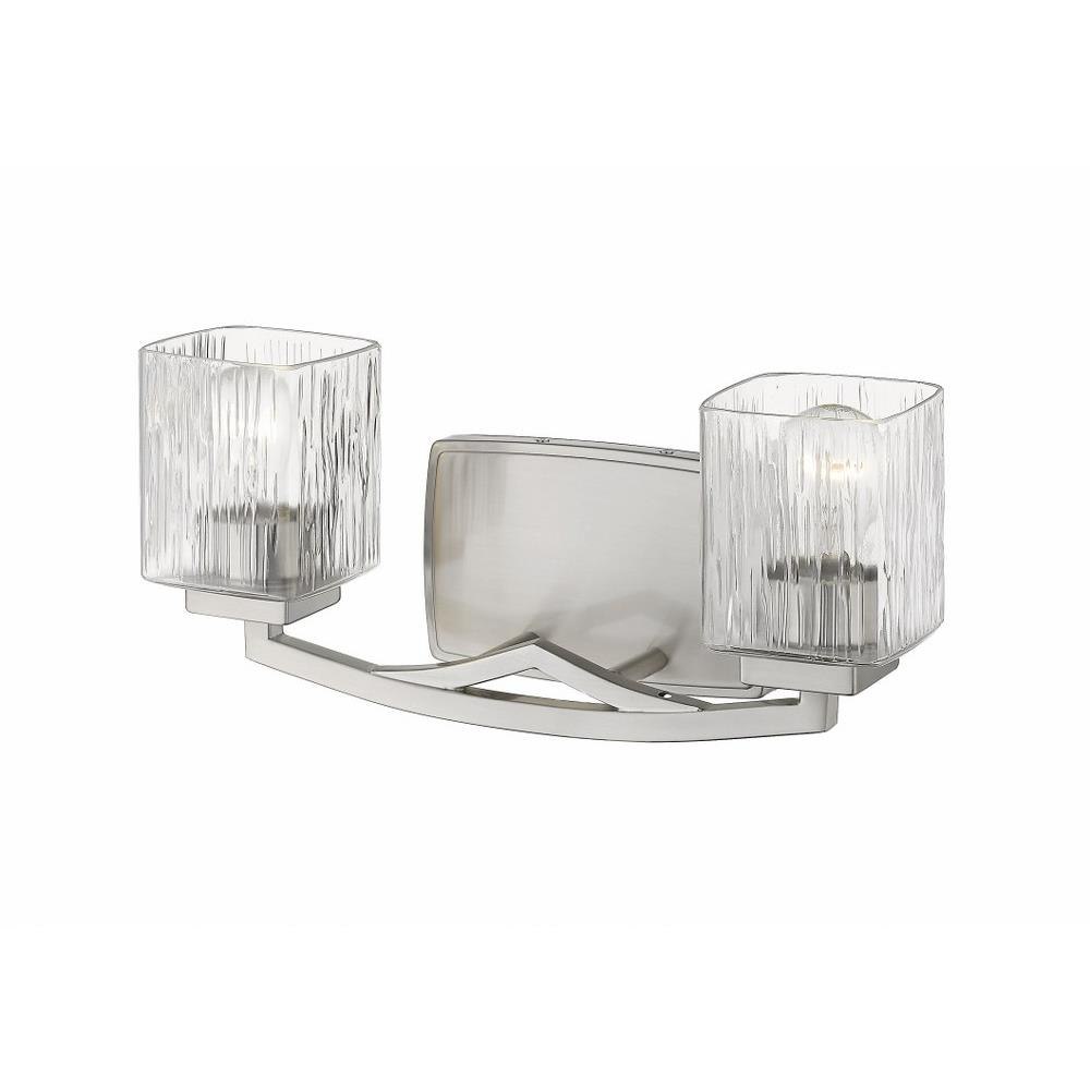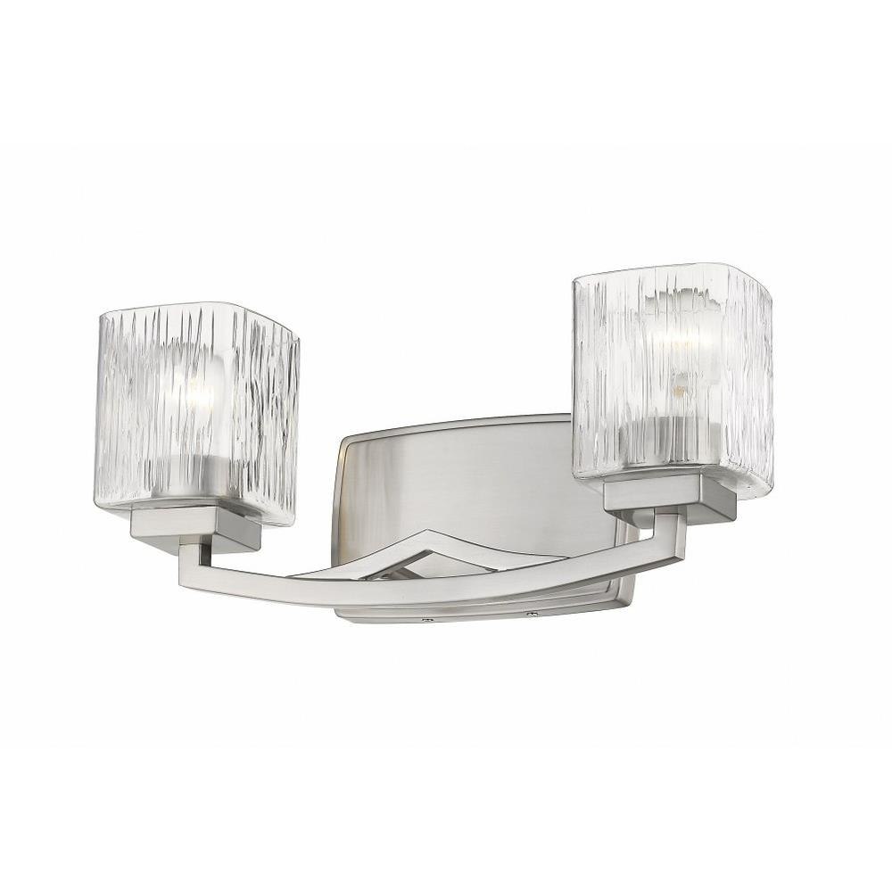 Metropolitan flavor makes its way into the design of this brushed nickel two-light vanity light. Add character to a contemporary space with a stylish steel frame that hosts a pair of chiseled clear glass shades.