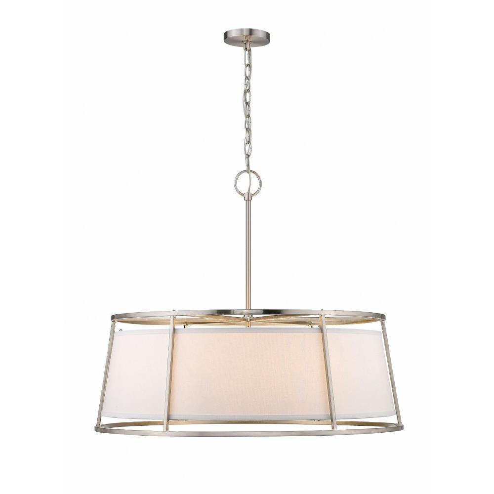 Illuminate your living space with the alluring glow of this elegant, eight-light pendant. With a versatile design that works well in almost any room, this sophisticated fixture blends a brushed nickel frame with a soft, white shade for beautiful ambiance.