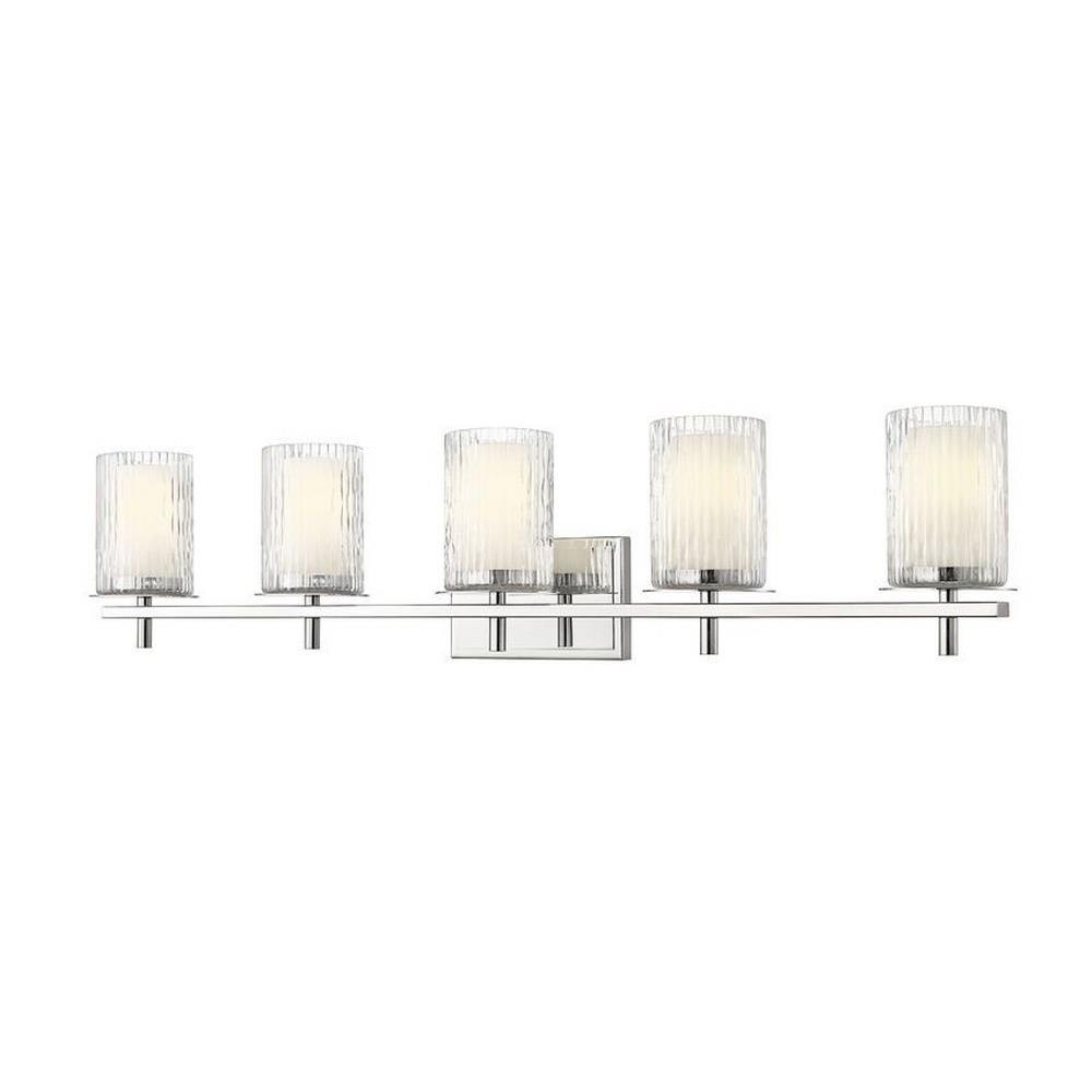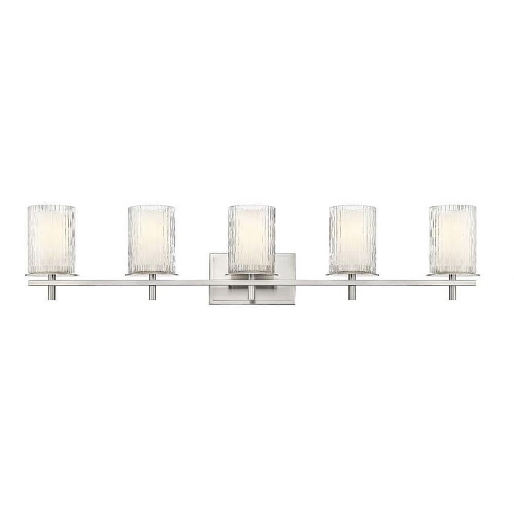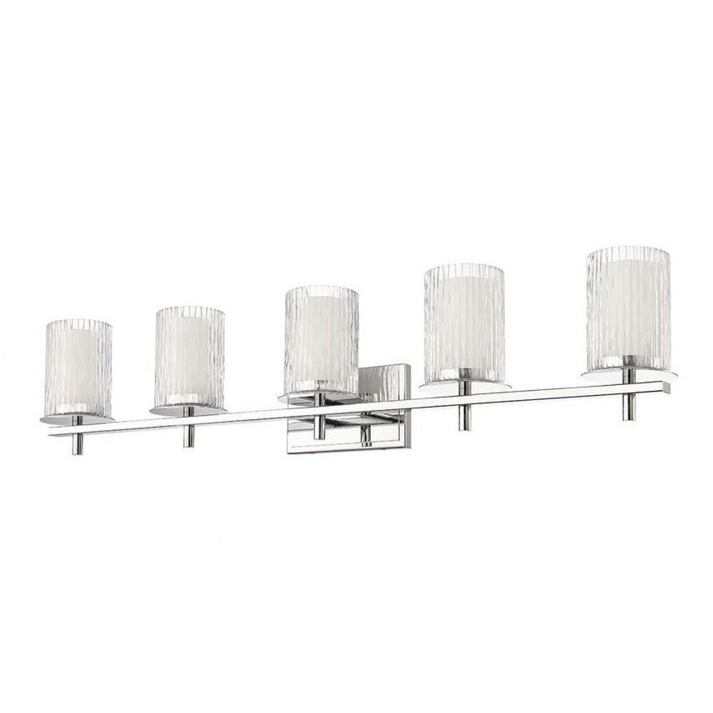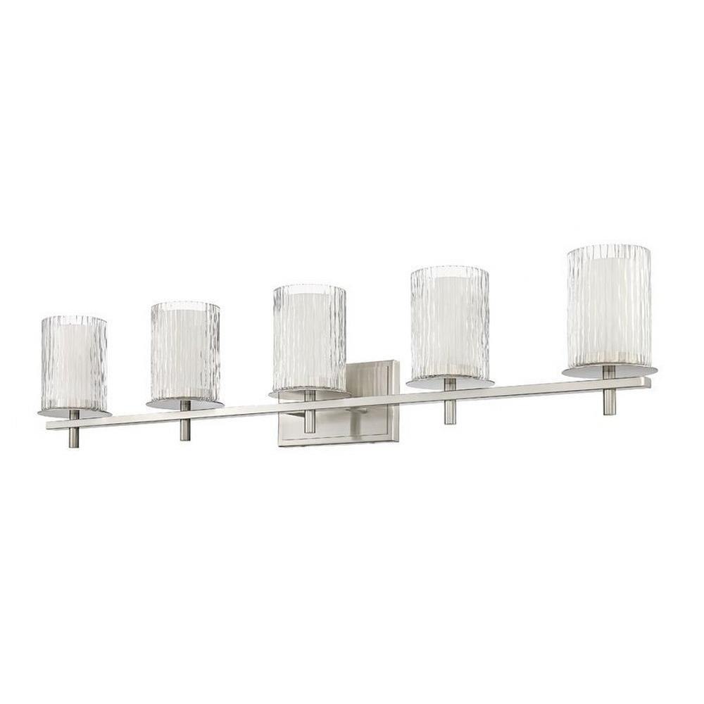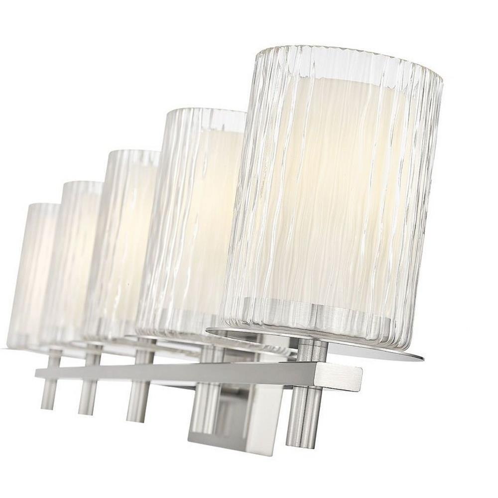 Choose this five-light vanity light to introduce classic artisan inspiration in a contemporary bath space. Intricate detail is textural and artisan with clear glasswork in a cylinder shape, with an inner white diffuser. Etched opal and clear glass blend as they enhance cool brushed nickel finish framing and show off a crisp mix of circles and lines.
