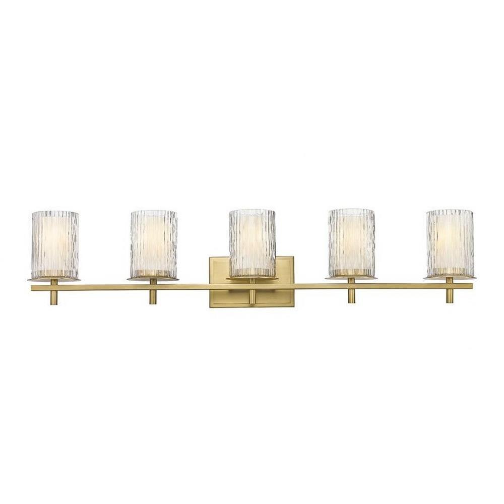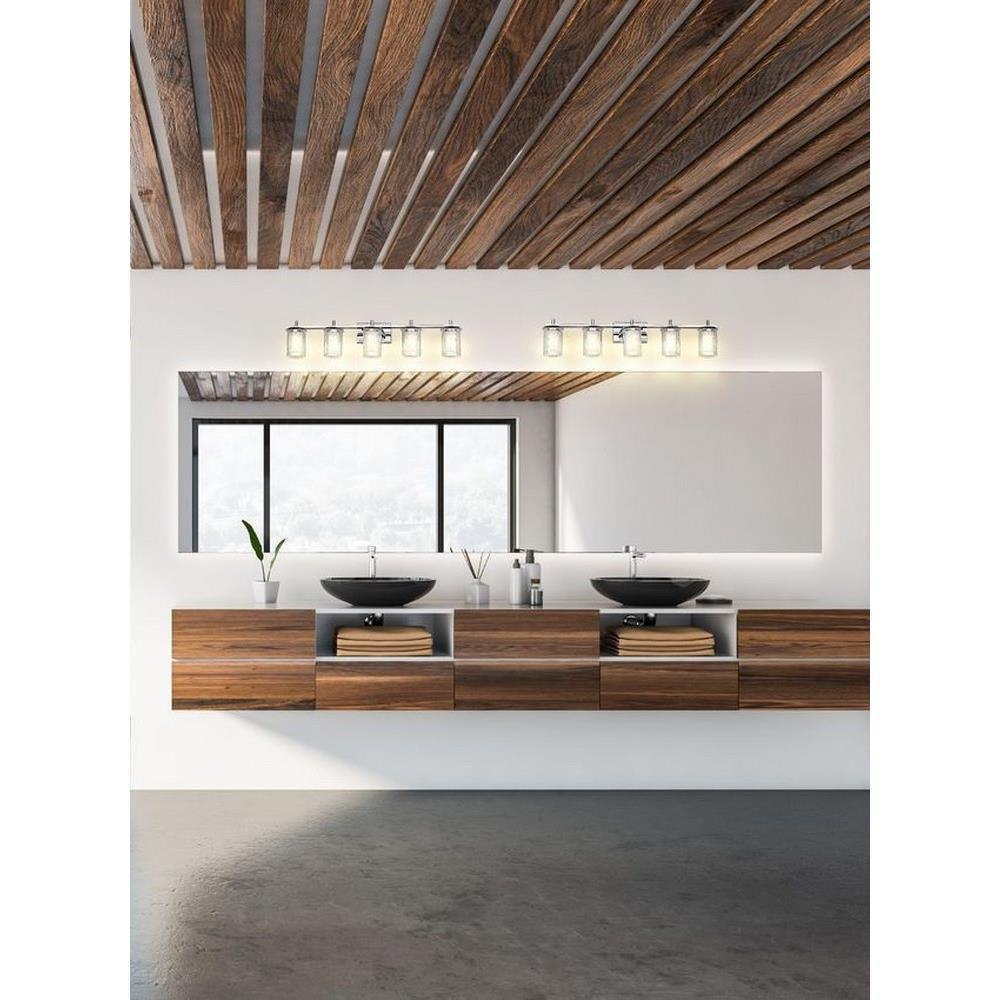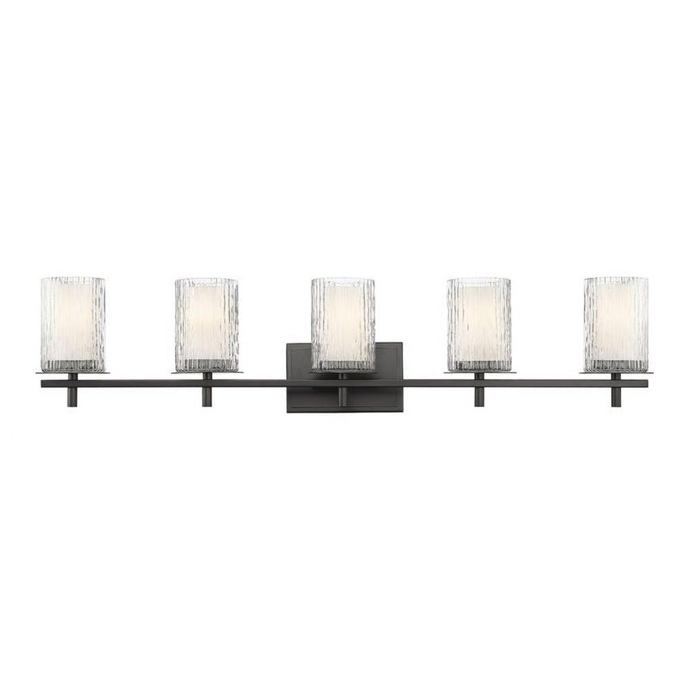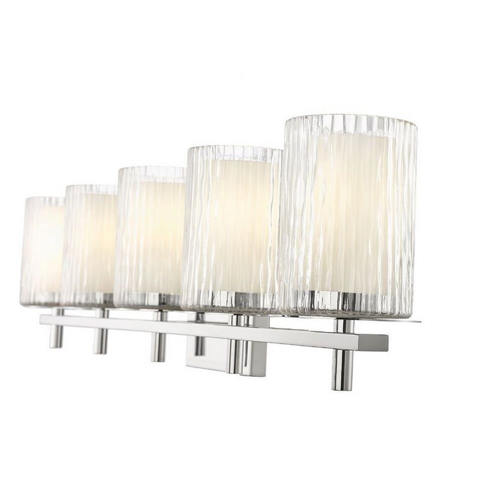 Choose this five-light vanity light to introduce classic artisan inspiration in a contemporary bath space. Intricate detail is textural and artisan with clear glasswork in a cylinder shape, with an inner white diffuser. Etched opal and clear glass blend as they enhance cool brushed nickel finish framing and show off a crisp mix of circles and lines.