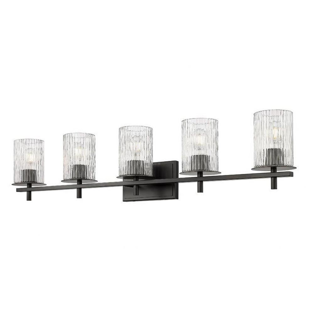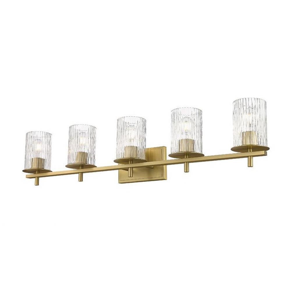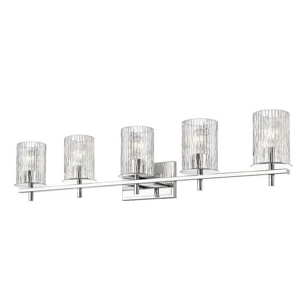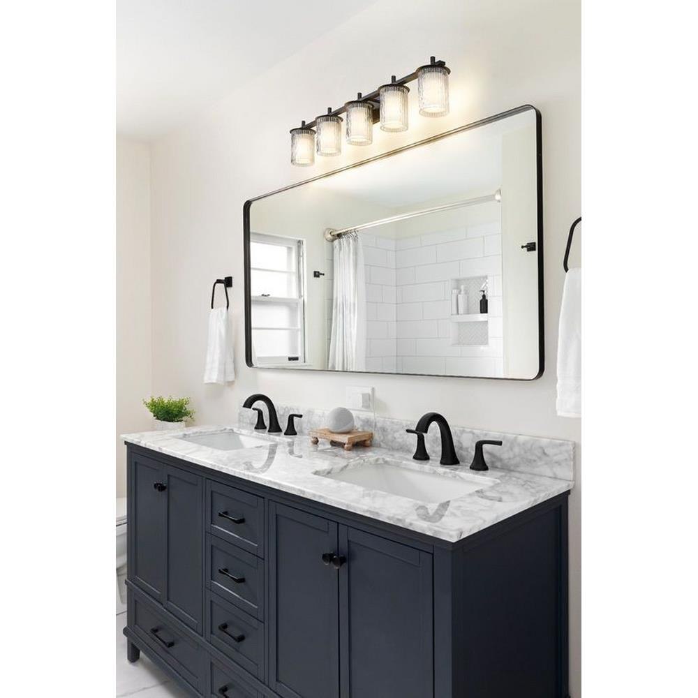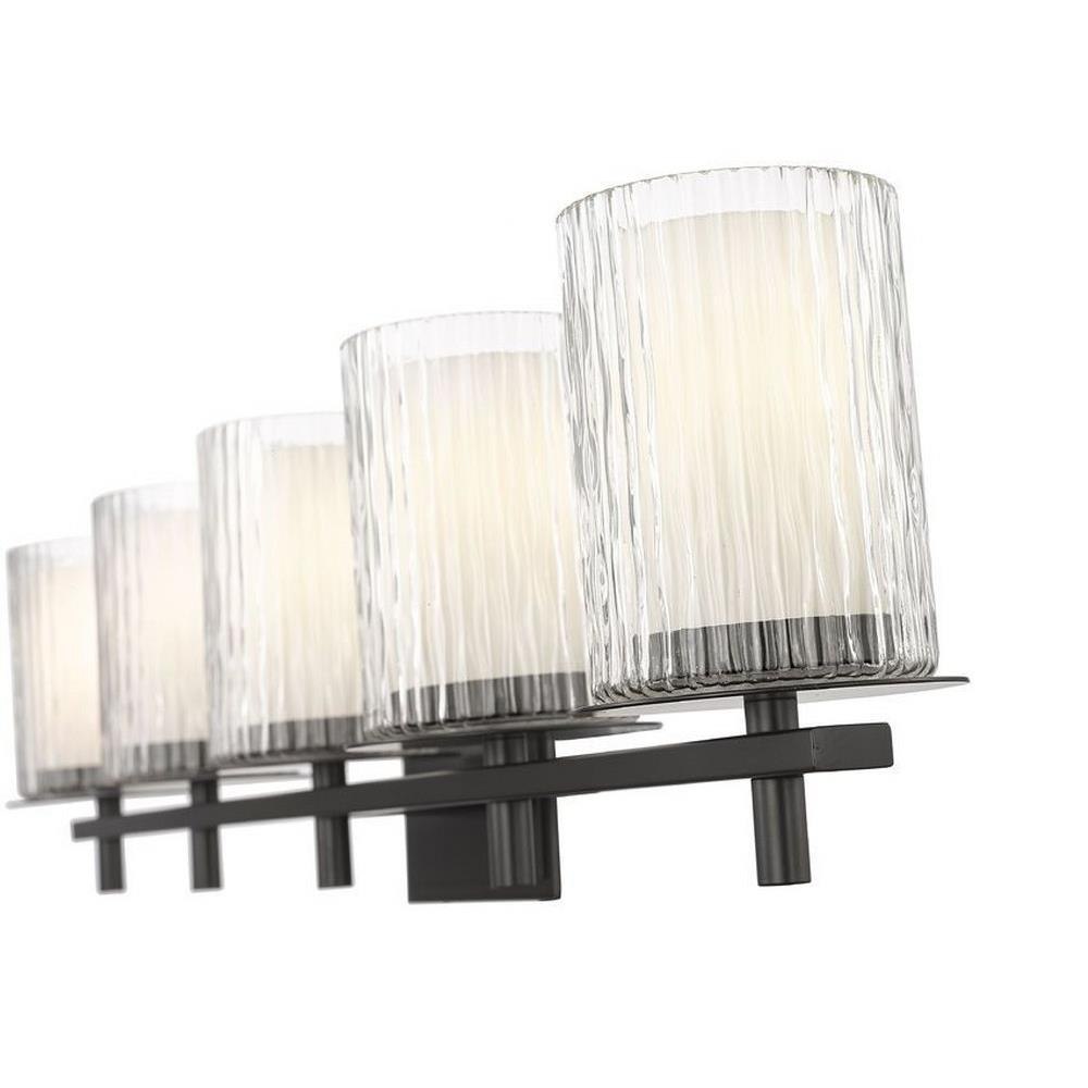 Choose this five-light vanity light to introduce classic artisan inspiration in a contemporary bath space. Intricate detail is textural and artisan with clear glasswork in a cylinder shape, with an inner white diffuser. Etched opal and clear glass blend as they enhance cool brushed nickel finish framing and show off a crisp mix of circles and lines.
