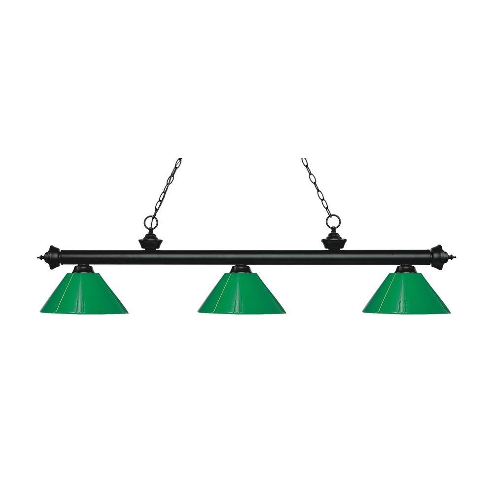 Traditional charm defines this three light fixture. The bar is finished in Matte Black and Antique Copper and is paired beautifully with three multi colored tiffany shades for an inviting glow. This fixture would be equally at home in the game room, or anywhere else in your home needing a touch of timeless charm.