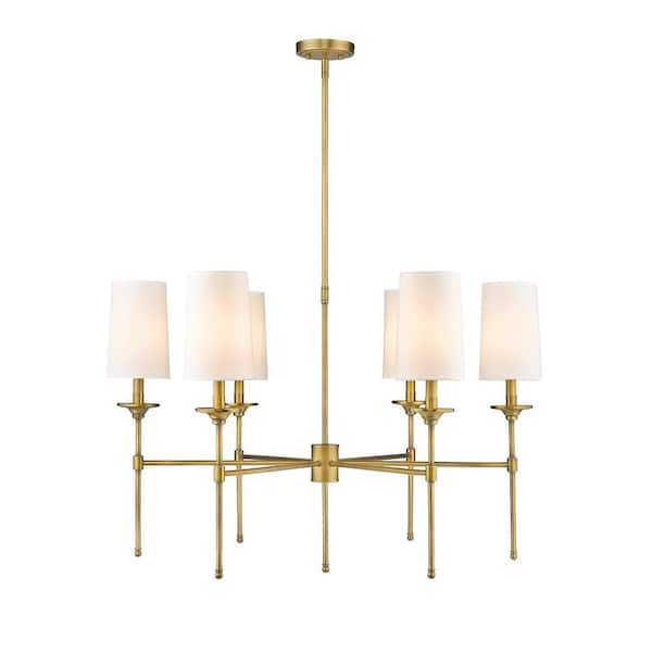Emily 6-Light Rubbed Brass Chandelier with Off White Cloth Cover Shades