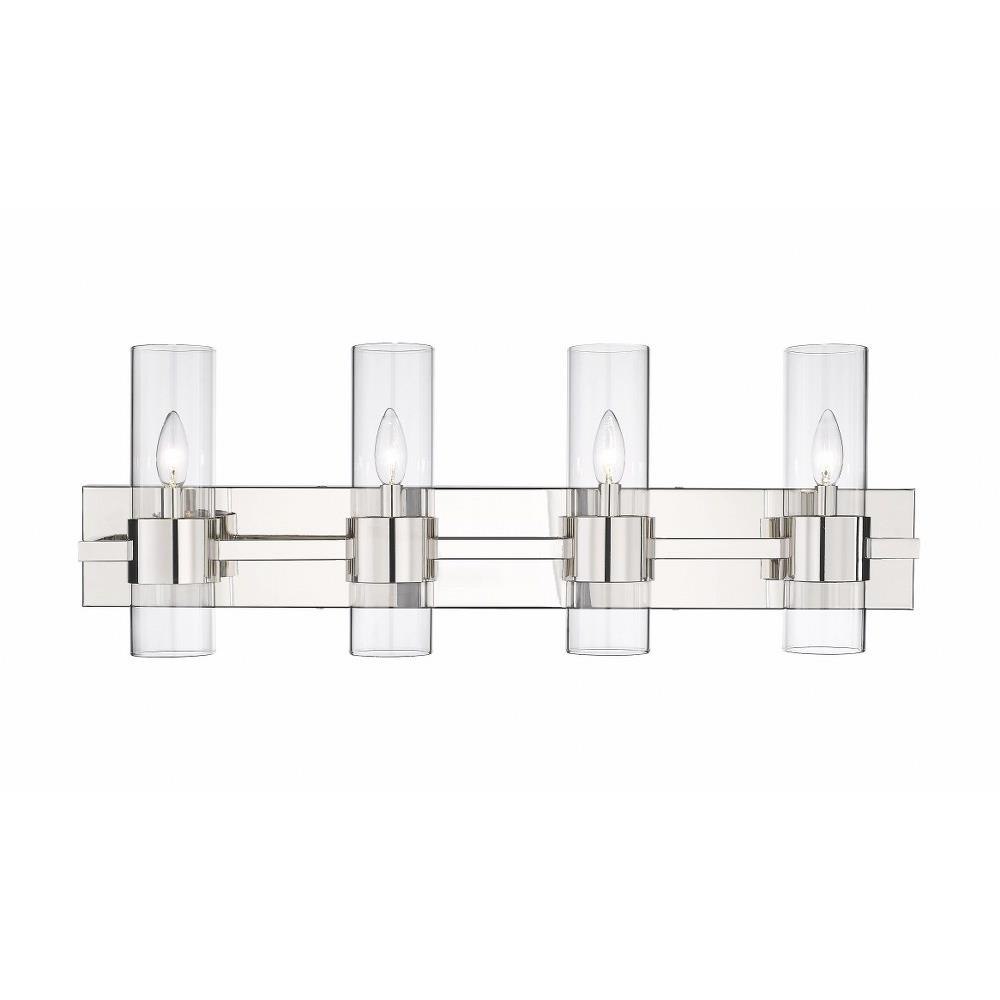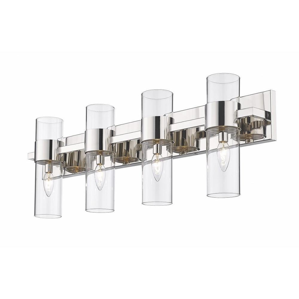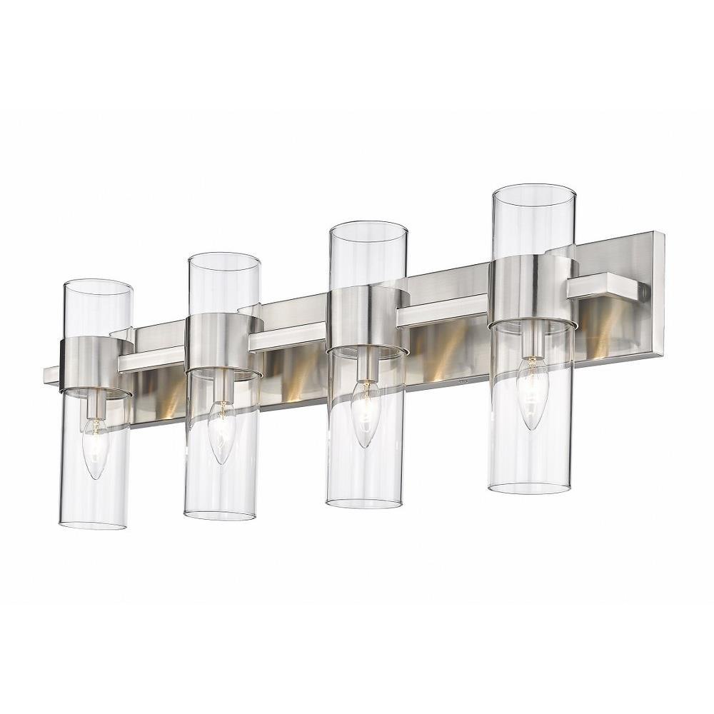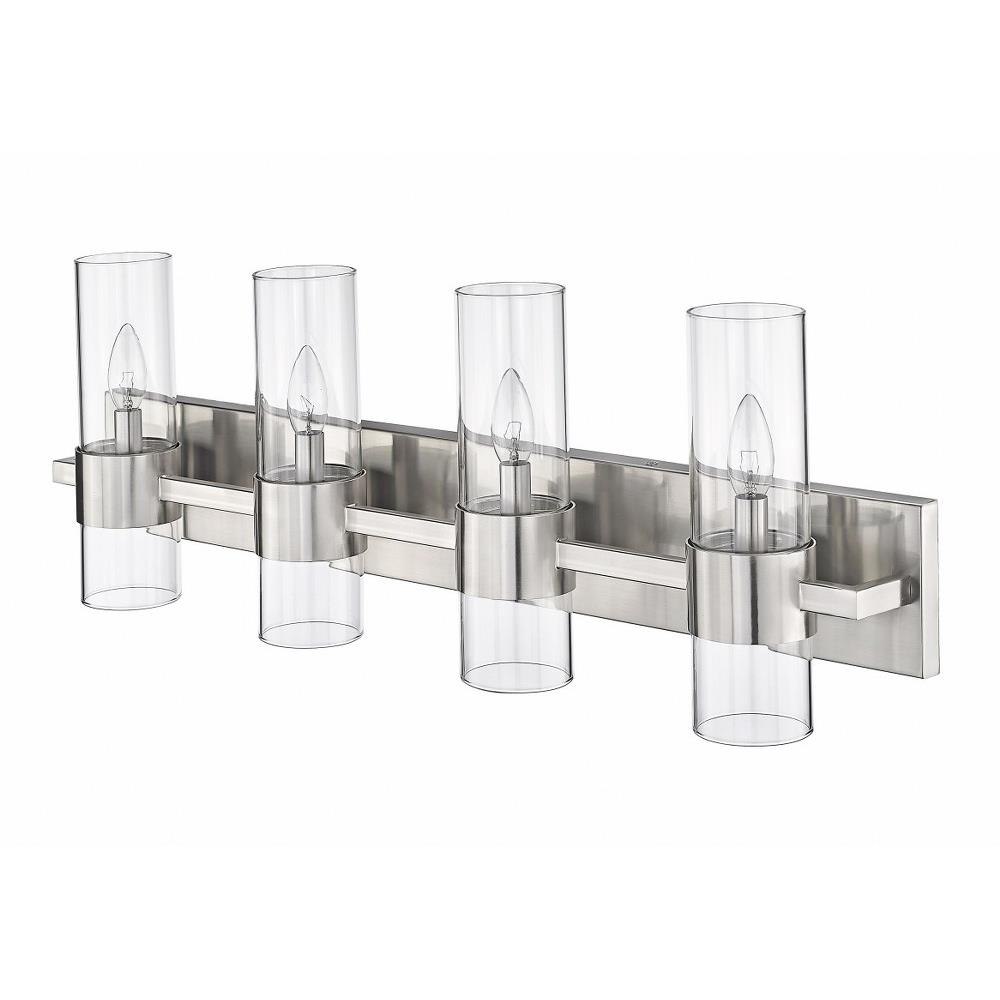 Create a chic minimalist expression with this linear contemporary vanity light, transforming en suite bathroom retreats into a tastefully adorned dressing area. This four-light vanity fixture presents an elongated steel plate in a shiny brushed nickel finish that suspends four lantern-like clear glass cylinder shades held in place by a wide band in the same finish, creating a metallic touch to a bathroom space. Match existing bathroom hardware and fixtures effortlessly and illuminate the space with this stunning and sophisticated modern vanity light, placing it over a spacious countertop or full-length wall mirror.