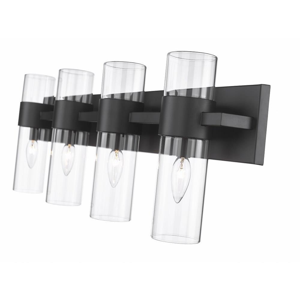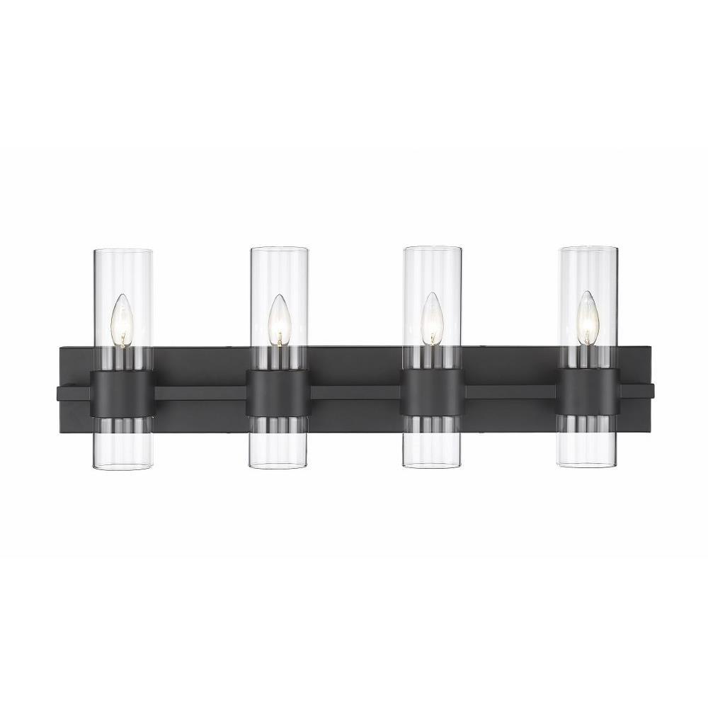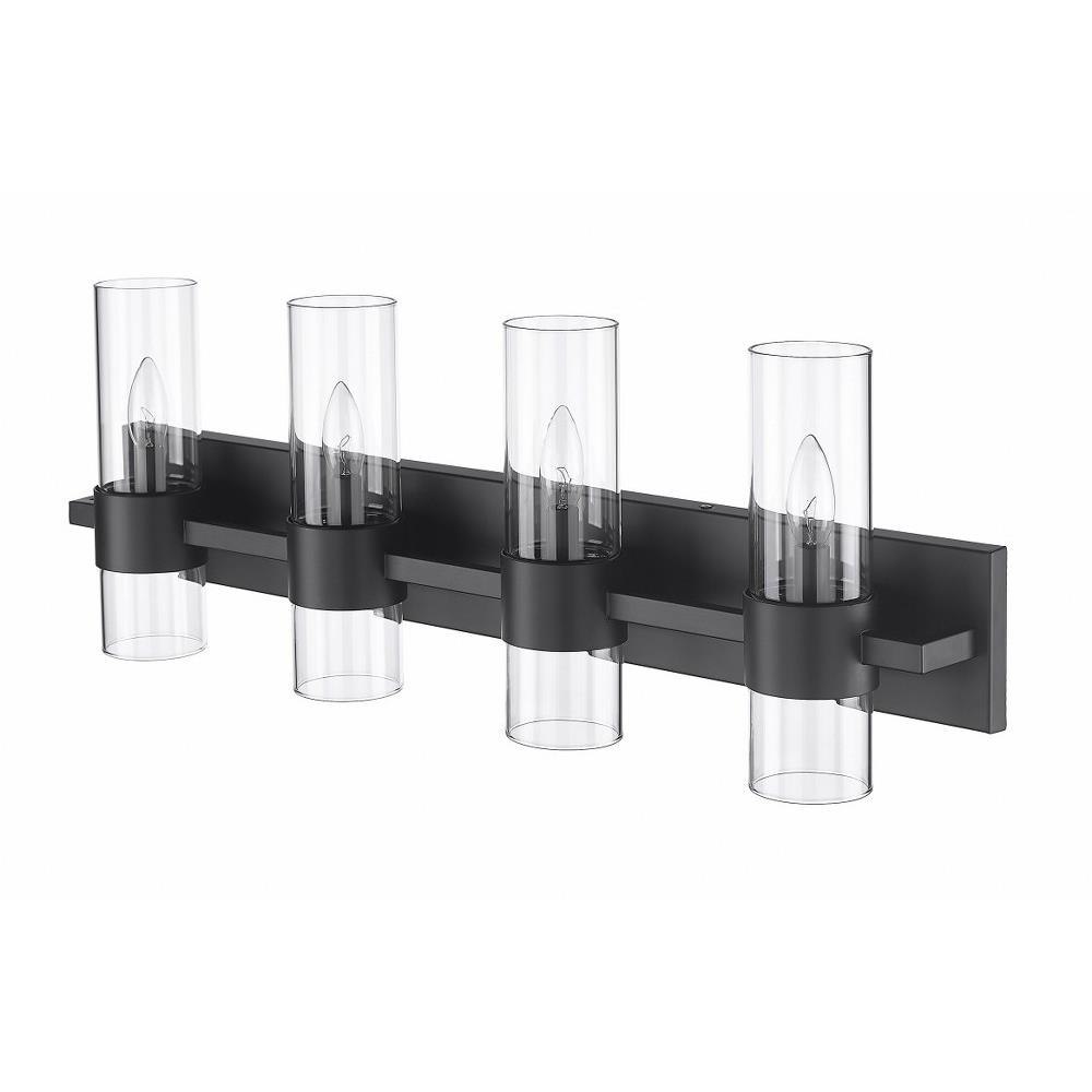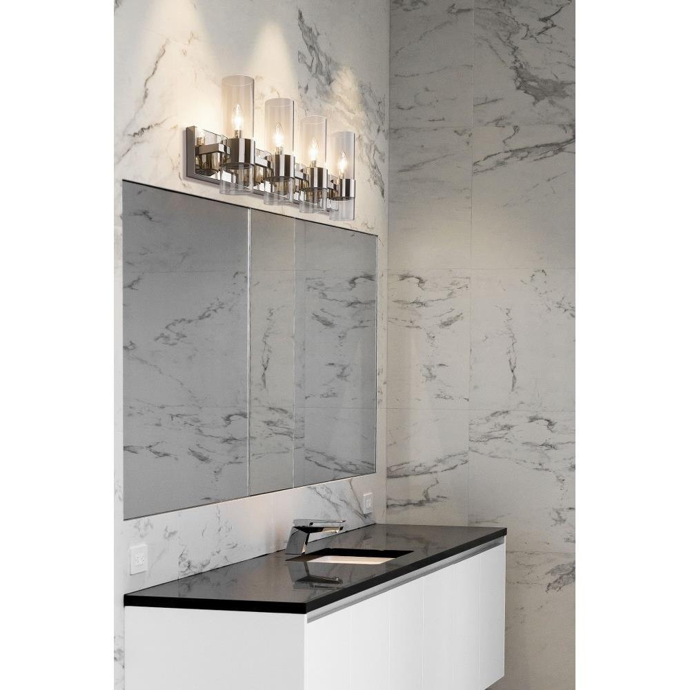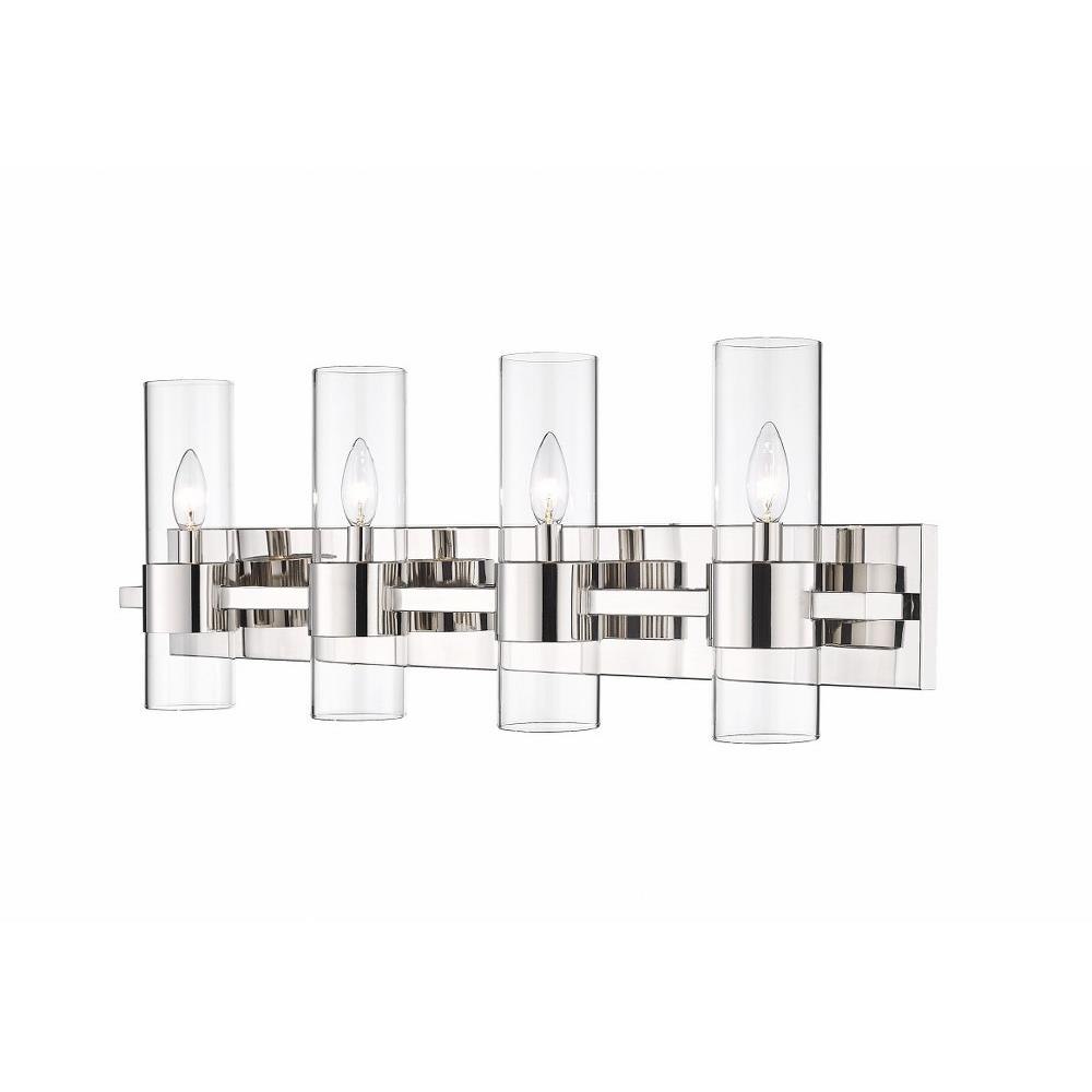 Create a chic minimalist expression with this linear contemporary vanity light, transforming en suite bathroom retreats into a tastefully adorned dressing area. This four-light vanity fixture presents an elongated steel plate in a shiny brushed nickel finish that suspends four lantern-like clear glass cylinder shades held in place by a wide band in the same finish, creating a metallic touch to a bathroom space. Match existing bathroom hardware and fixtures effortlessly and illuminate the space with this stunning and sophisticated modern vanity light, placing it over a spacious countertop or full-length wall mirror.