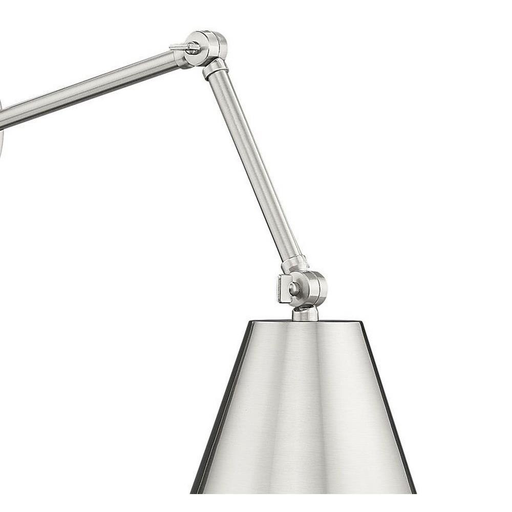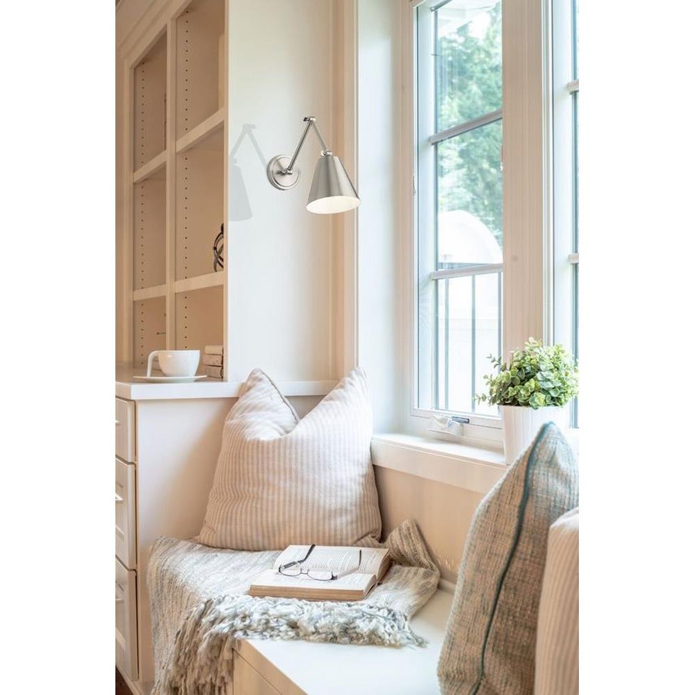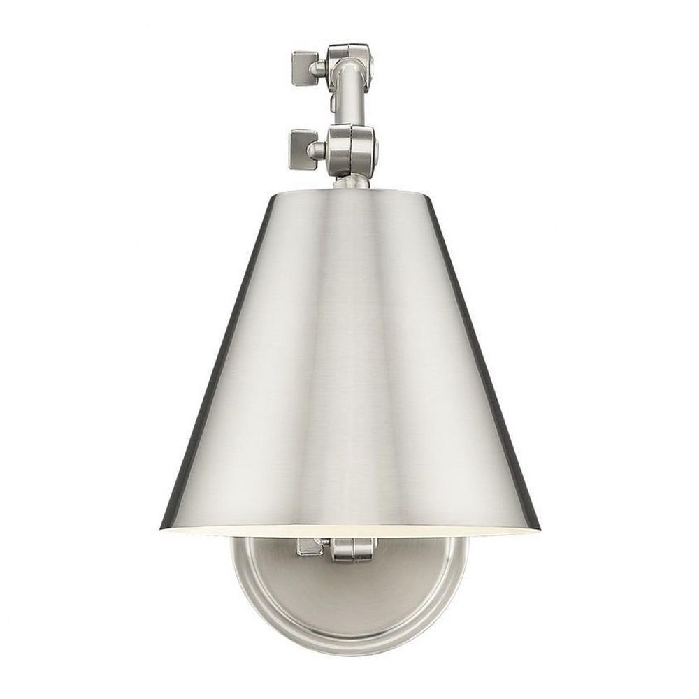 A cool brushed nickel finish begins a traditional motif with flexibility and versatility in this one-light wall sconce. Steel construction is true to its functional aesthetic, making the most of a wall-mounted sconce offering adjustable positioning of a cone shade. This fixture makes an excellent light for reading and task-mastering, as well as mood lighting ideal for a low-key setting.