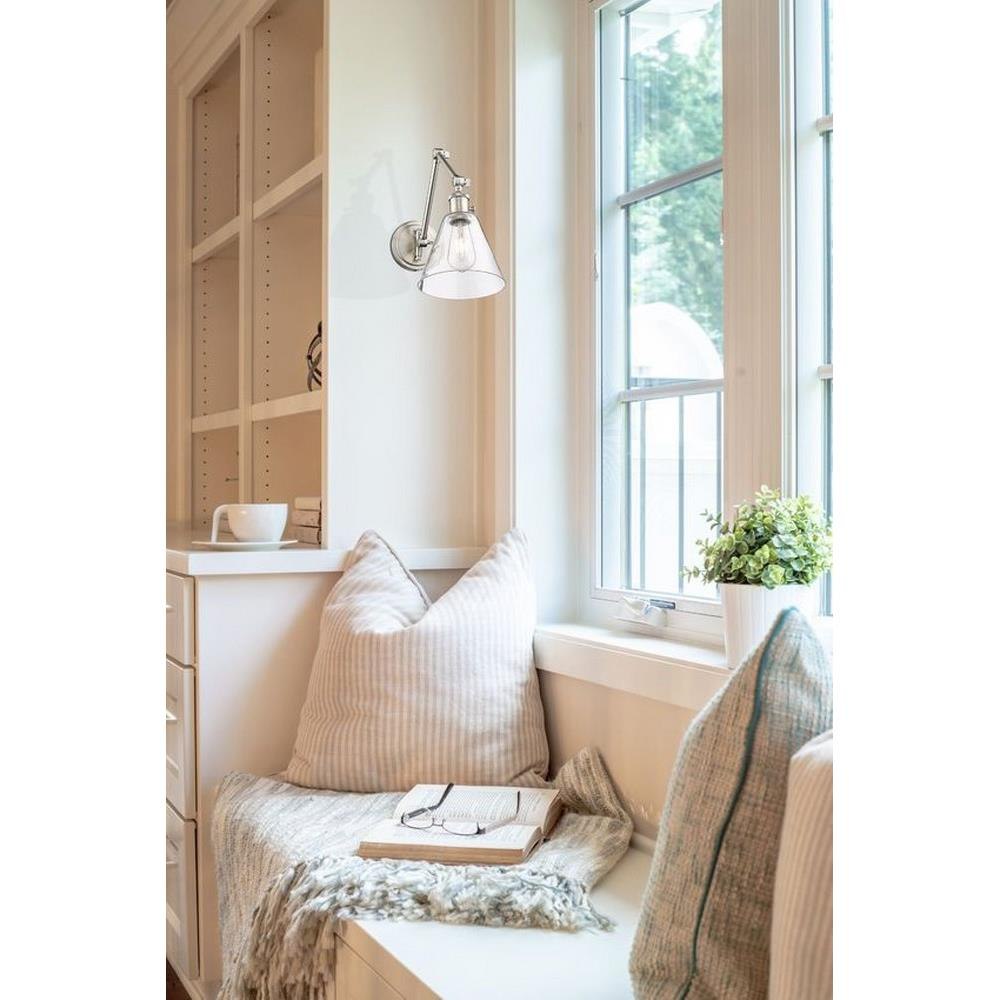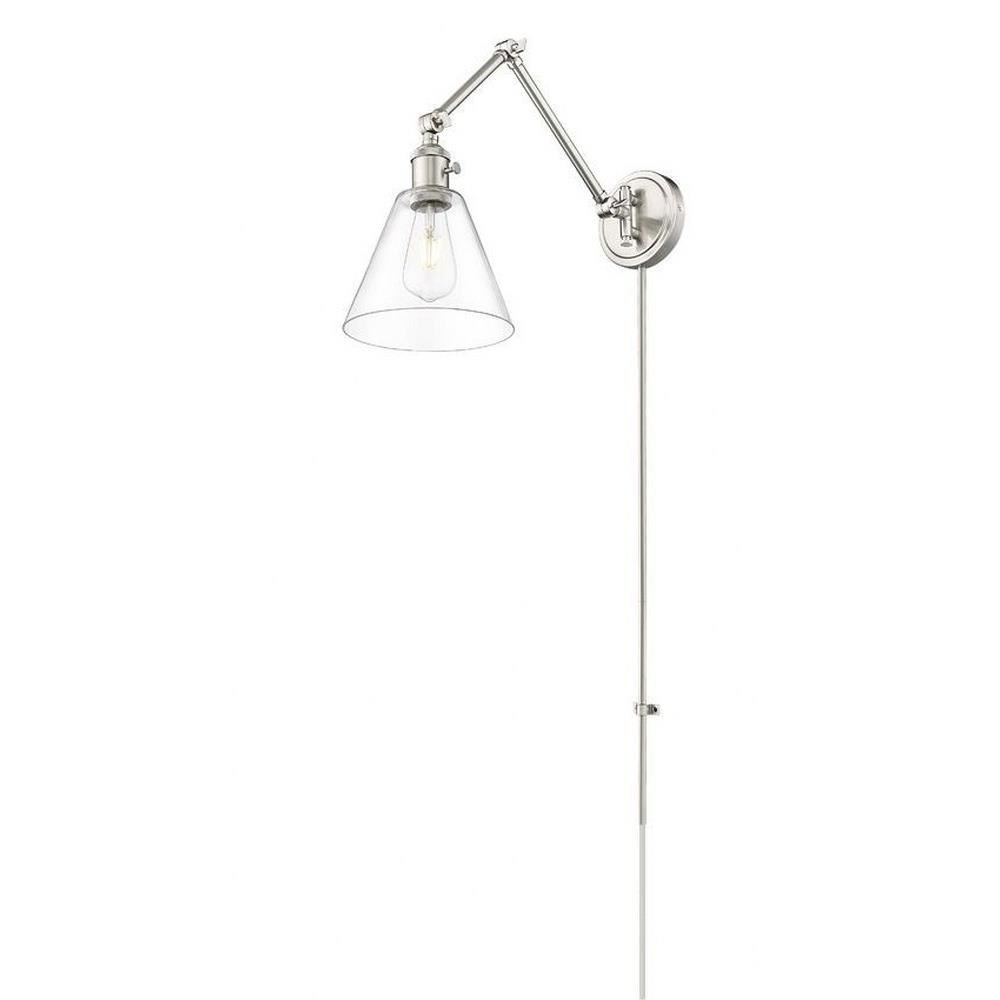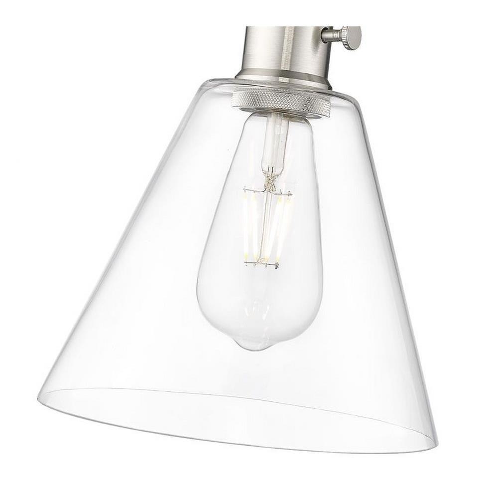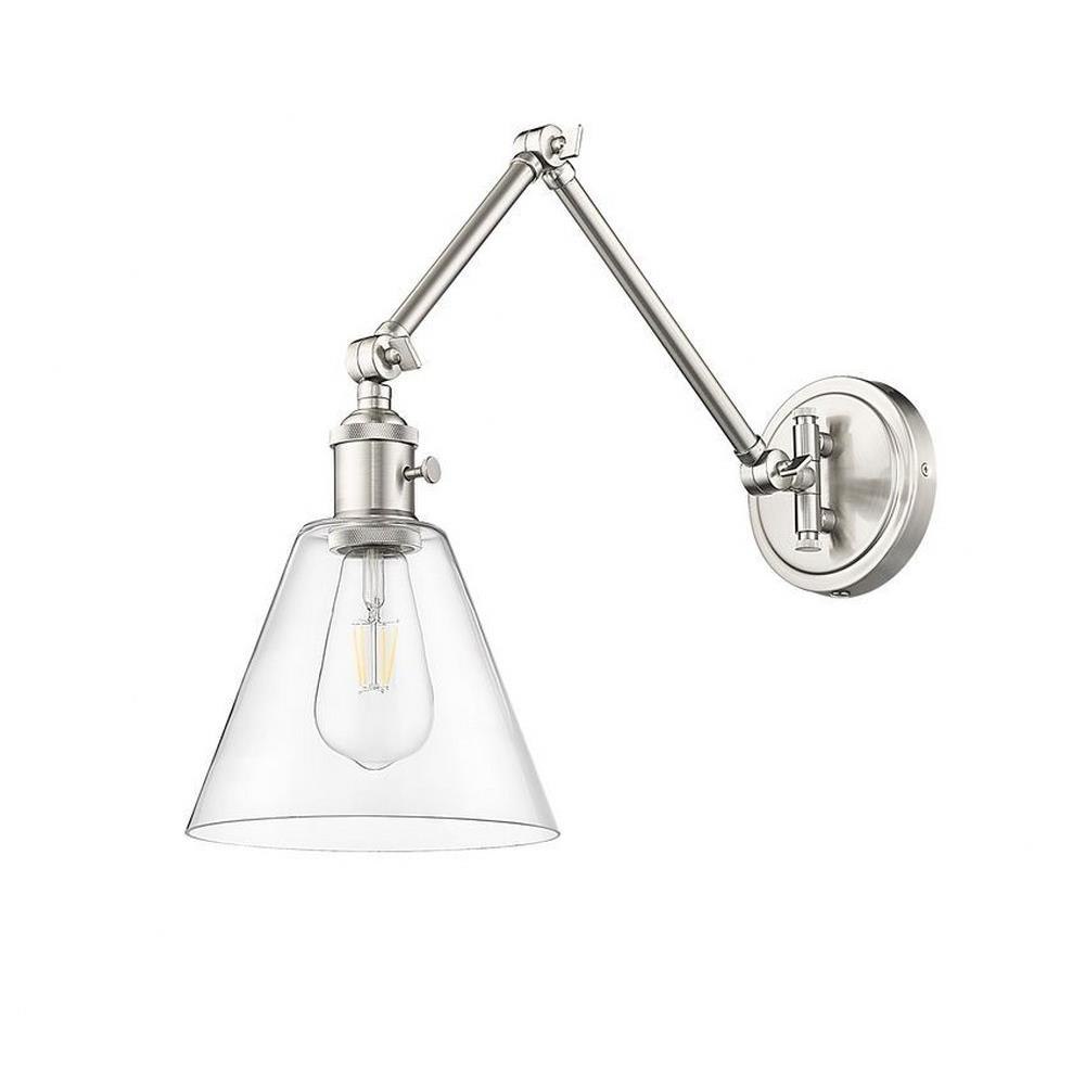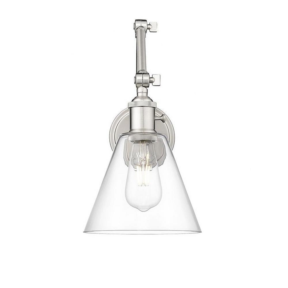 Mixed motifs offer an exquisite form of industrial style in a one-light wall sconce offering the perfect blend of glam and industrial design aesthetics. Constructed of chic brushed nickel steel framing and a conical clear glass shade, it delivers utility in an adjustable configuration making it easy to achieve customizable lighting levels. Install through hard-wiring or purchase separate simple and portable cord-and-plug mounting to move from space to space.