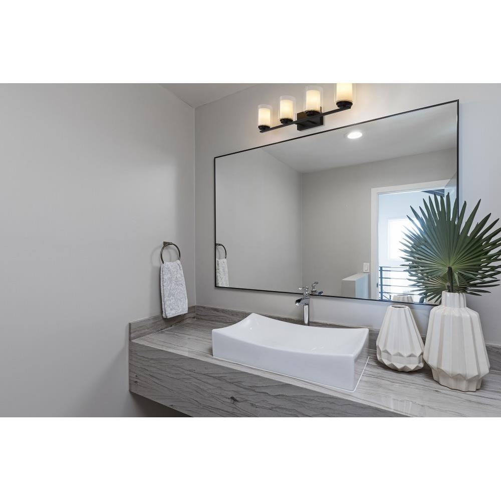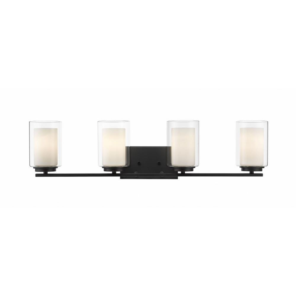 Give your powder room a chic, sophisticated update. This beautiful, matte black vanity light features four glowing bulbs beneath four delicate, glass shades that are white on the inside and clear on the outside. An exquisite lighting option to highlight your refined sense of style.