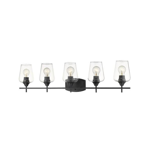 Upscale sophistication with a Mid Century Modern vibe tells the story of this elegant five-light vanity light. A blend of delightful materials offers stunning large glass shades with bold Matte Black finish metal, offering an enticing frame to illuminate a custom master or guest bath sink.