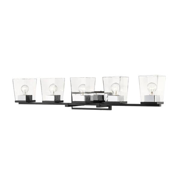With a sleek cosmopolitan attitude and a beautiful blend of glass and metal, this five-light vanity offers a sophisticated way to stylize a contemporary master or guest bath space. Matte Black and brilliant Chrome serve as stunning finishes for a tasteful fixture delivering a geometric silhouette serving as a focal point in a custom space.
