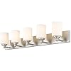 Let your bathroom or hallway bask in soft, warm light. This contemporary five-light wall sconce has a sophisticated, streamlined look, and extends from a long mirrored plate for extra gleam. From the sconce's cylindrical white etched glass shades to its chrome finish, this fixture stylishly upgrades your space.