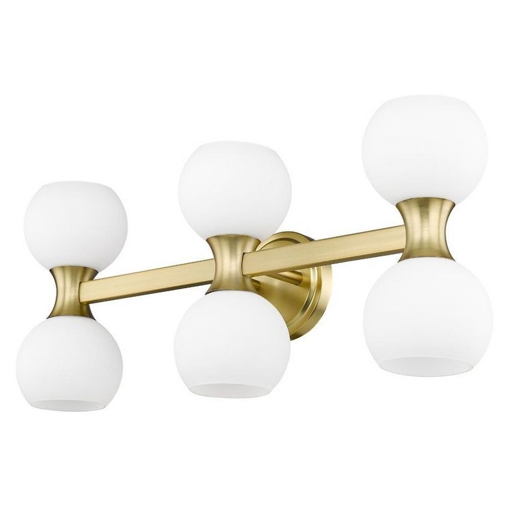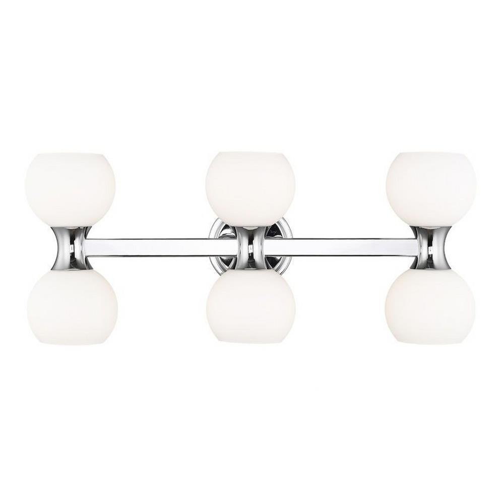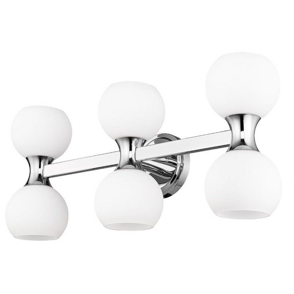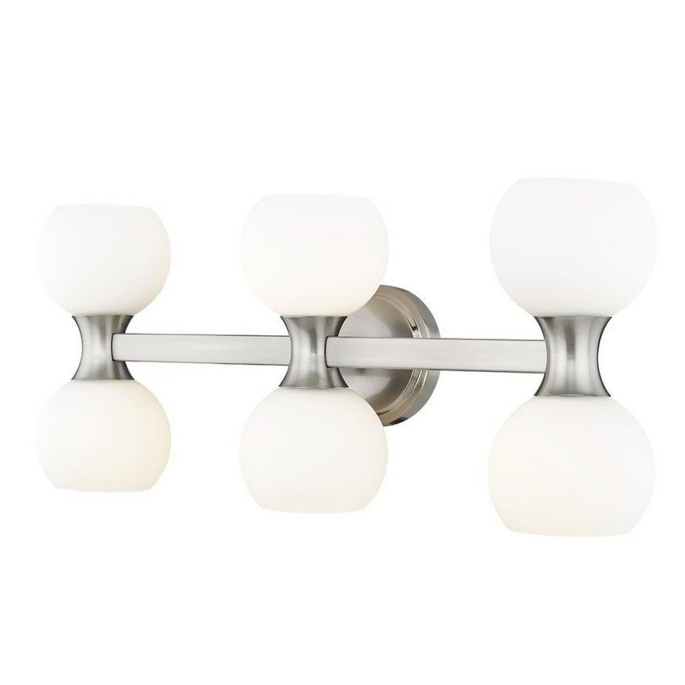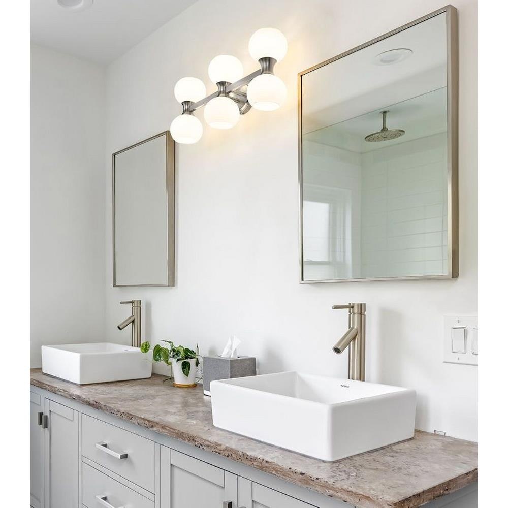Symmetry and balance juxtaposed with subtle artful curves create an unforgettable Mid-Century Modern aesthetic in this six-light vanity light from the Artemis collection, a perfect choice for a casual bath space with upscale taste. Follow the delightful convex shapes of a chic brushed nickel finish steel frame and the delicate flavor of matte opal glass globe shades. Delivering both uplighting and downlighting, this vanity light brings solid illumination to an ensuite or guest bathroom.