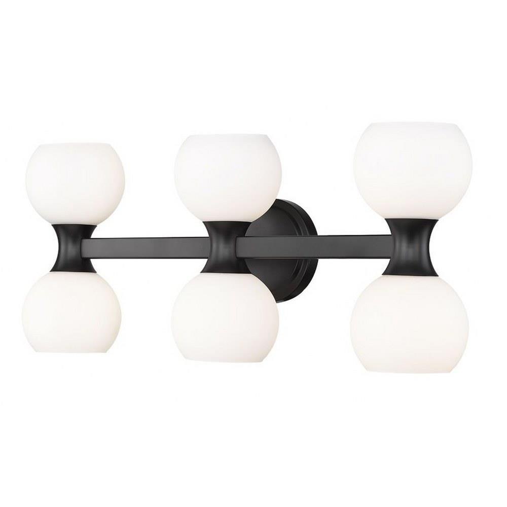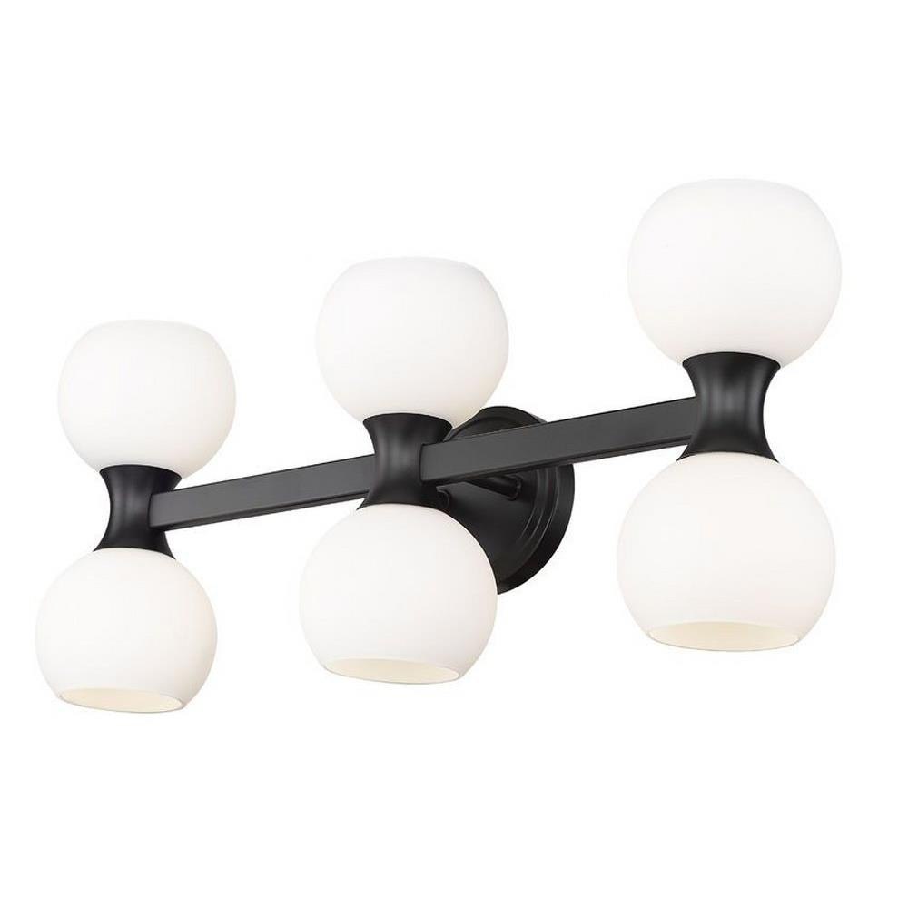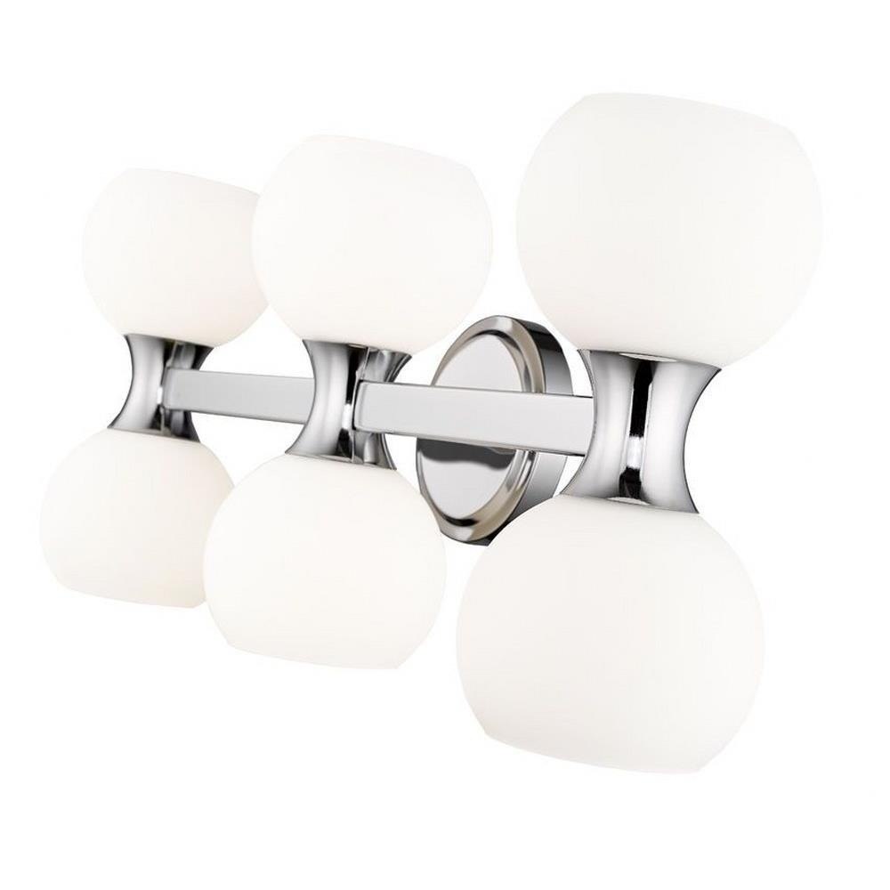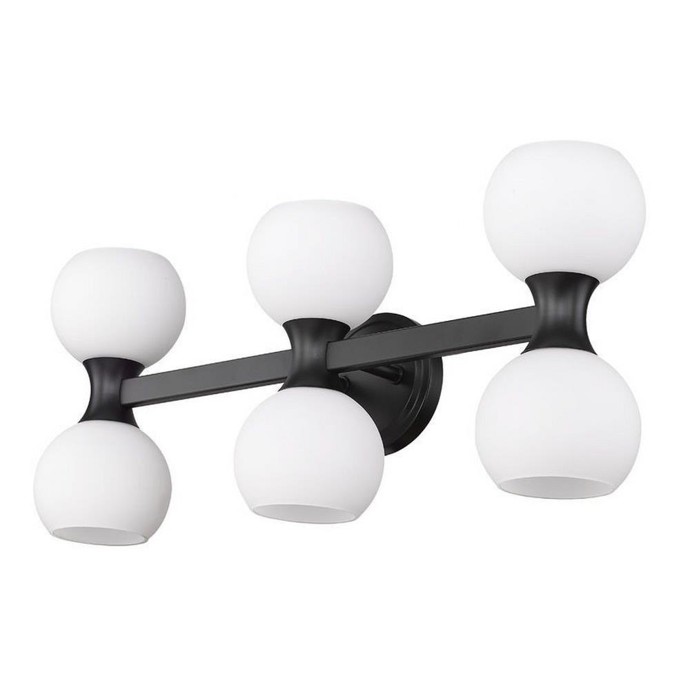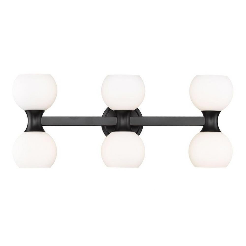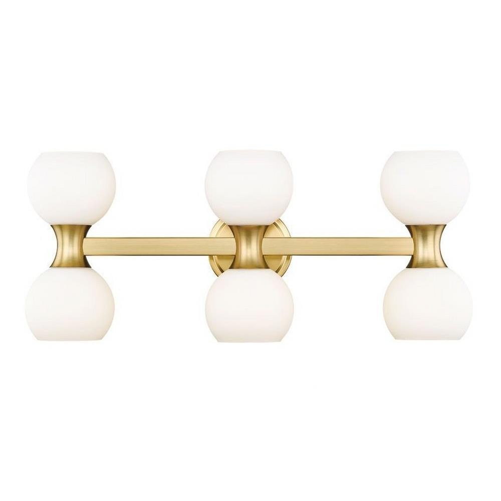 Symmetry and balance juxtaposed with subtle artful curves create an unforgettable Mid-Century Modern aesthetic in this six-light vanity light from the Artemis collection, a perfect choice for a casual bath space with upscale taste. Follow the delightful convex shapes of a chic brushed nickel finish steel frame and the delicate flavor of matte opal glass globe shades. Delivering both uplighting and downlighting, this vanity light brings solid illumination to an ensuite or guest bathroom.