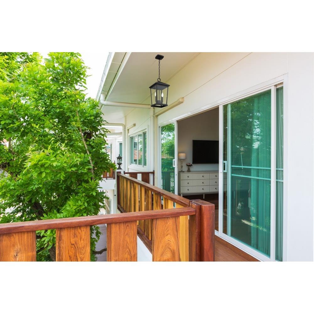 Rich hues and clean structure from this two-light hanging light are stunning in an outdoor space. The lantern-inspired silhouette warms with a rubbed bronze hue.
