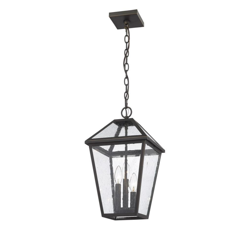 Illuminate an exterior front or back yard space with a classic fixture reflecting a charming village theme. Made from Rubbed Bronze metal and seeded glass panels, this three-light outdoor chain mount ceiling light brings a design-forward look to wrap up a tasteful and functional patio or porch space.