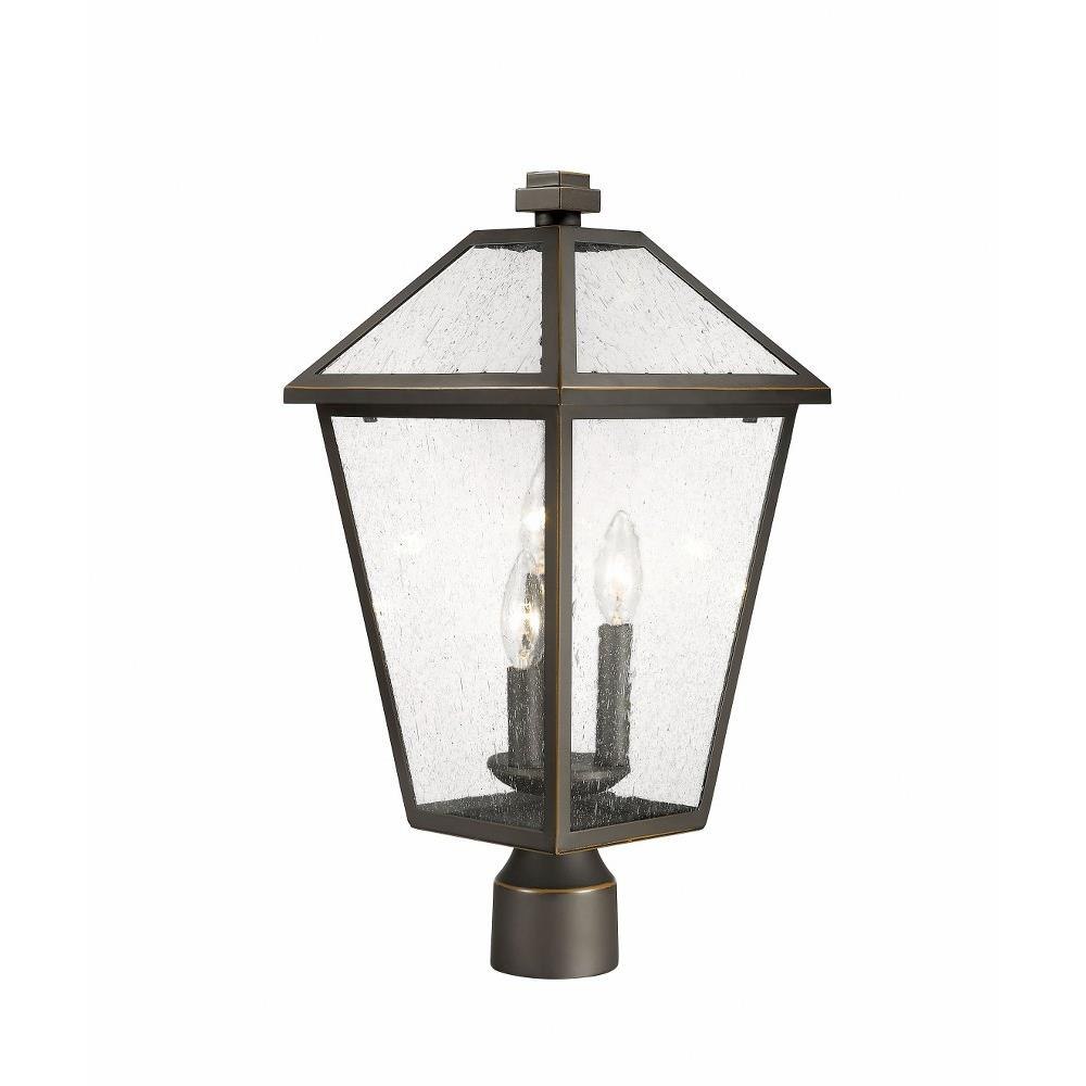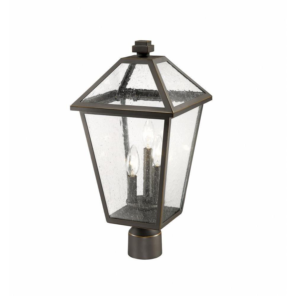 Illuminate an exterior front or back walkway with a classic fixture reflecting a charming village theme. Made from Rubbed Bronze metal and seedy glass panels, this three-light outdoor post mount fixture delivers a charming upgrade with industrial-inspired attitude that tops a custom chosen post.
