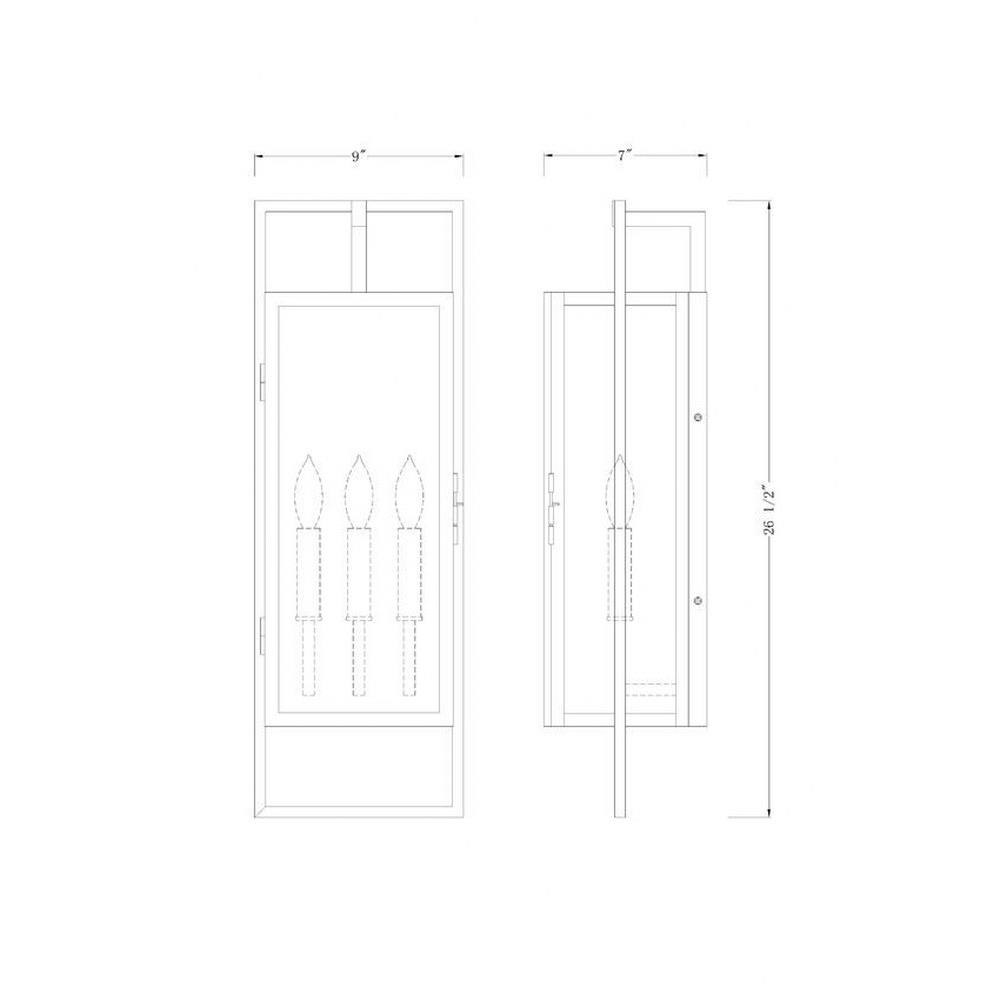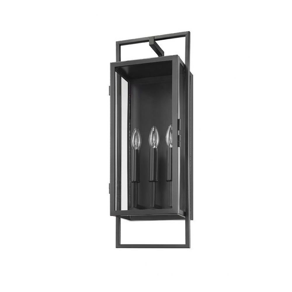 With a noticeable nod to contemporary style, this energetic exterior fixture offers a superb complement to updated spaces. The Lucian three-light outdoor wall sconce builds on a box-inspired base with an extra open base, showcasing an alignment of three candelabra style bulbs. Clear glass serves as an unobtrusive shield protecting bulbs, as bold black finish steel construction delivers a commanding presence.