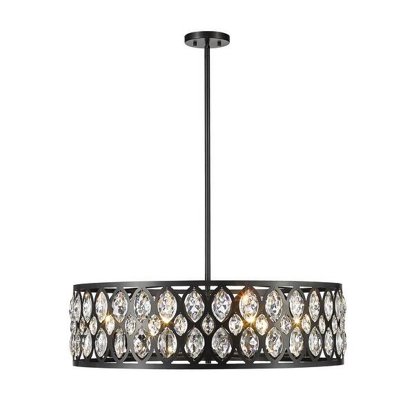 From the Dealey collection comes this elegant, wide eight-light chandelier. Featuring a dazzling ellipse-carved steel shade, which surrounds each of the eight candelabras, this chandelier lends a striking contrast with a blend of its dark matte black finish and glimmering clear crystal pendants. Cast a warm glow and illumination over a dining table or contemporary living room while adding a touch of glamour.