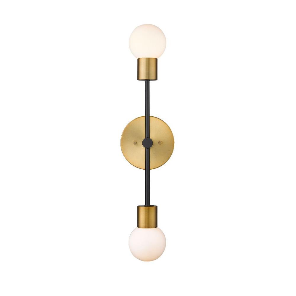 This stylish two-light wall sconce from the Neutra collection lends a mid-century modern flair with a subtle Art Deco vibe. Ideal for a contemporary master suite, this dual pendant wall sconce features a steel structure, complete with polished foundry brass and matte black finishes. In addition, this wall sconce lends a soft, soothing glow with its two stacked opal globes.