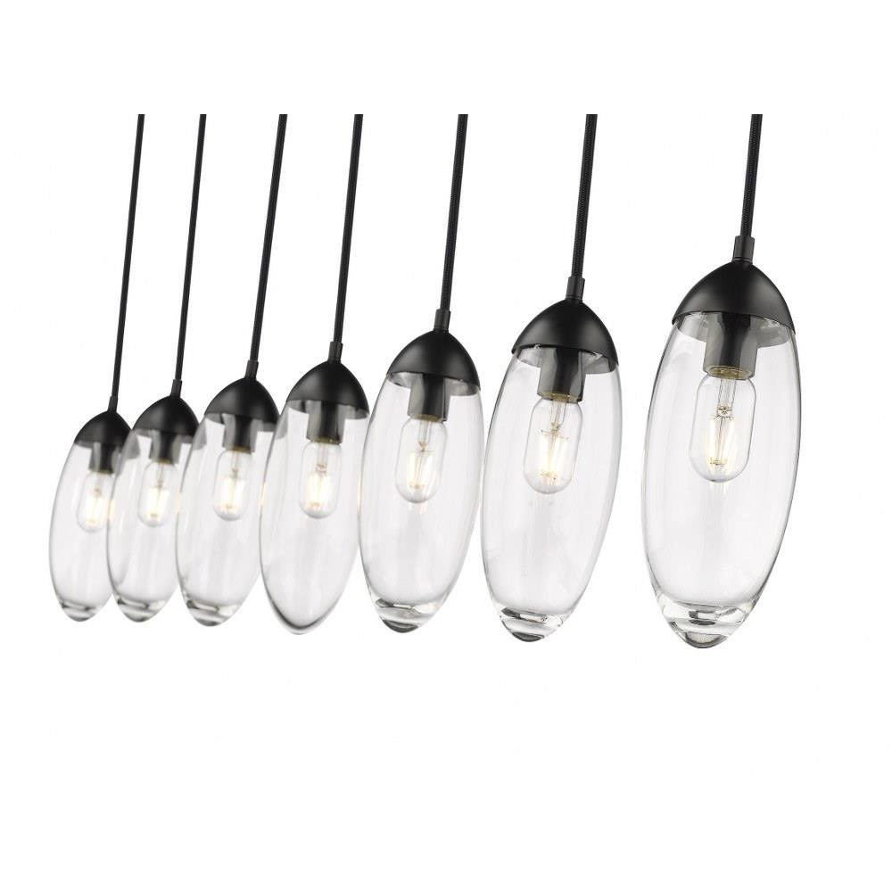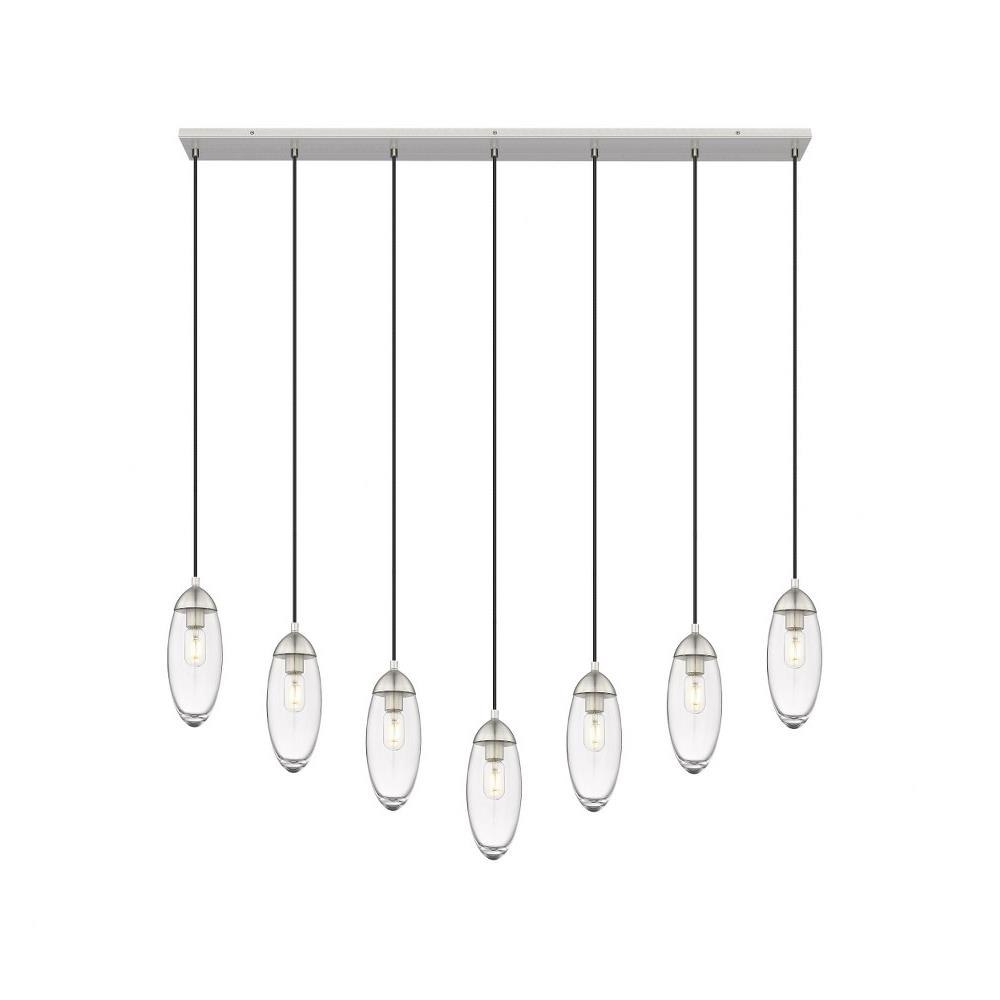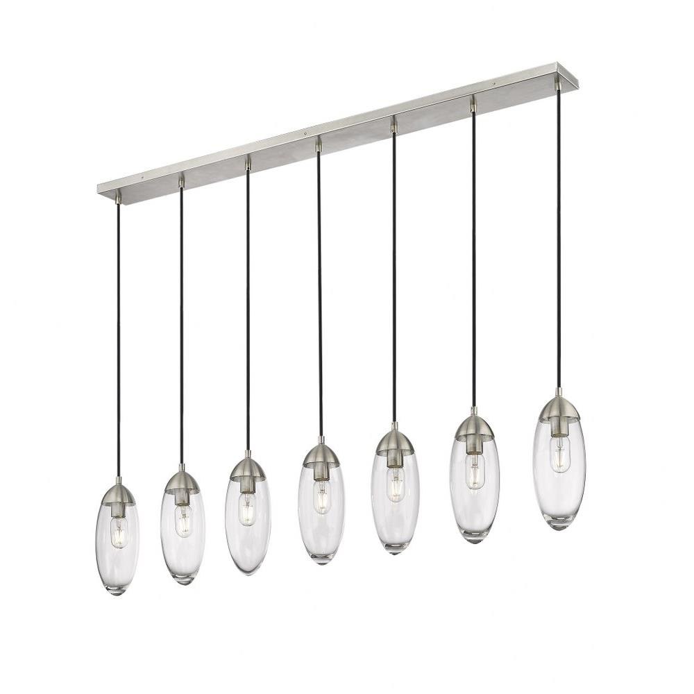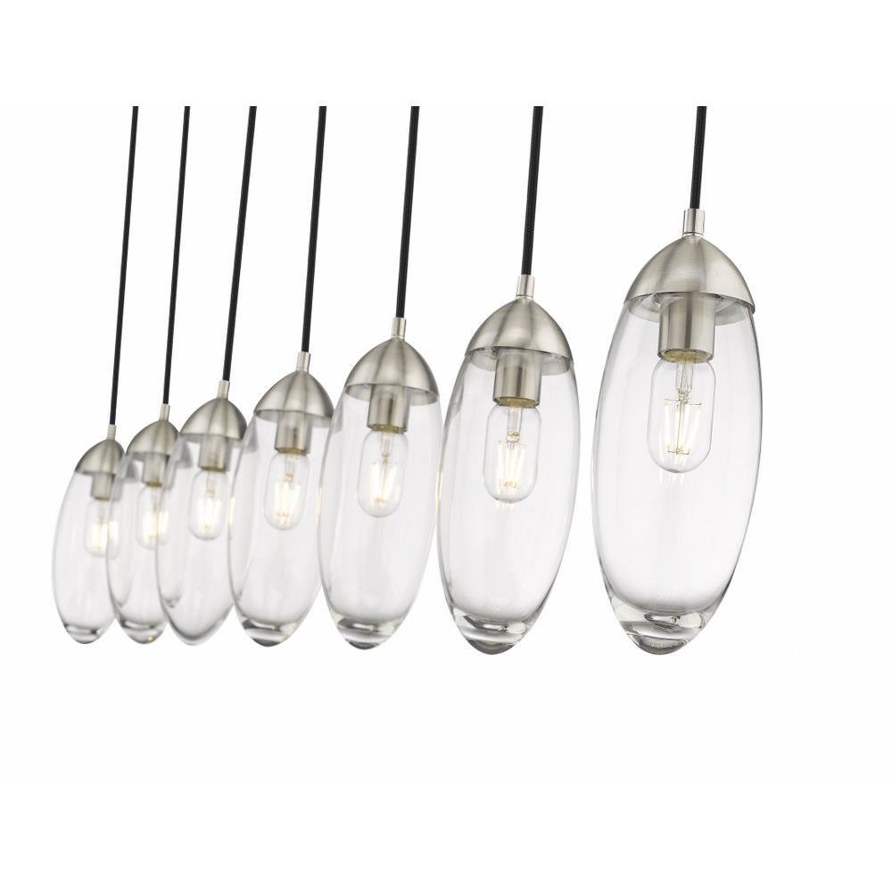 Customize a modern interior design scheme lighting suited to sleek elegance. A careful arrangement of delicate glass teardrop shades forms a minimalist silhouette with maximal impact as this seven-light chandelier becomes an expression of sophistication in a contemporary setting. Placed over an island, dining ensemble, or living area, this fixture with a brushed nickel finish metal canopy offers a sought-after mix of organic and gallery-inspired flavor.