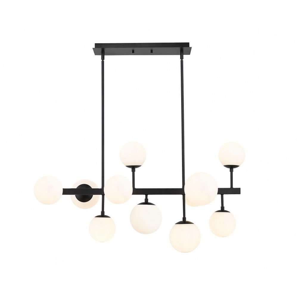 Send visual cues upward to capture a whimsical, charming look in an entertainment space. Modern styling with strong industrial elements forms a delightful island/billiard light that works in a casual kitchen as well. A linear matte black finish steel frame sets the stage for a festive arrangement of eleven matte opal glass globe bulbs to create mood-lifting ambiance that lends a hint of space-age personality to this enticing light.