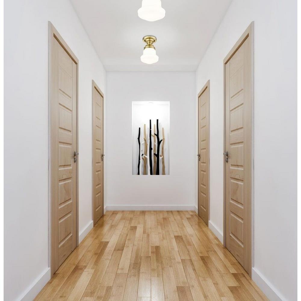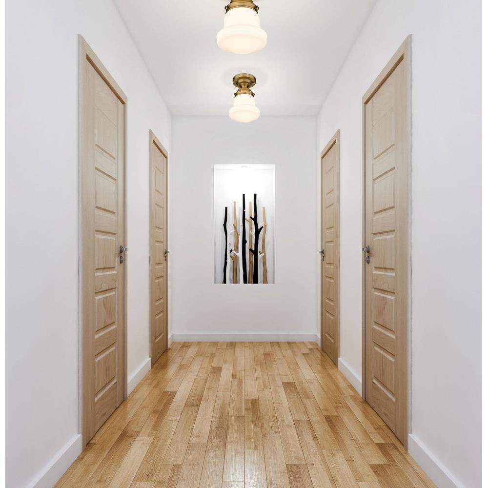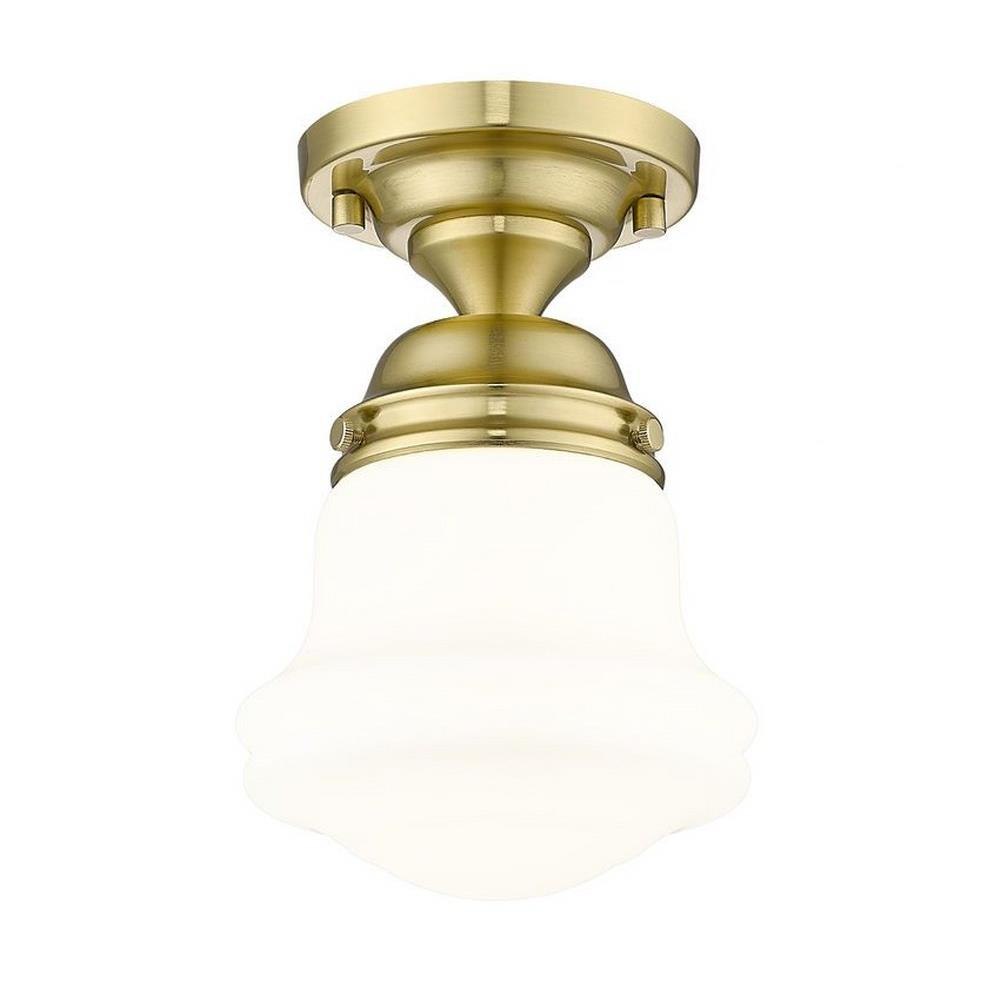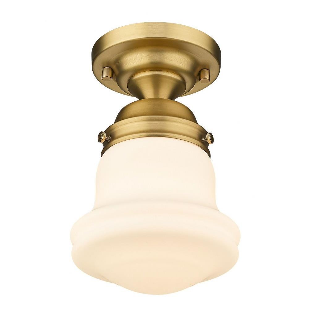 Elevate sophisticated classical interiors with the refined contoured silhouette and smooth surfaces of this petite restoration style flush mount. A small but powerful glow emits from the matte opal glass bell shade tucked within a heritage brass steel mount detailed with rivet accents that lend an industrial schoolhouse-inspired aesthetic and vintage flair. This classical single light flush mount offers a serene ambiance, illuminating foyers, hallways and compact spaces, as it offers a warm metallic touch.