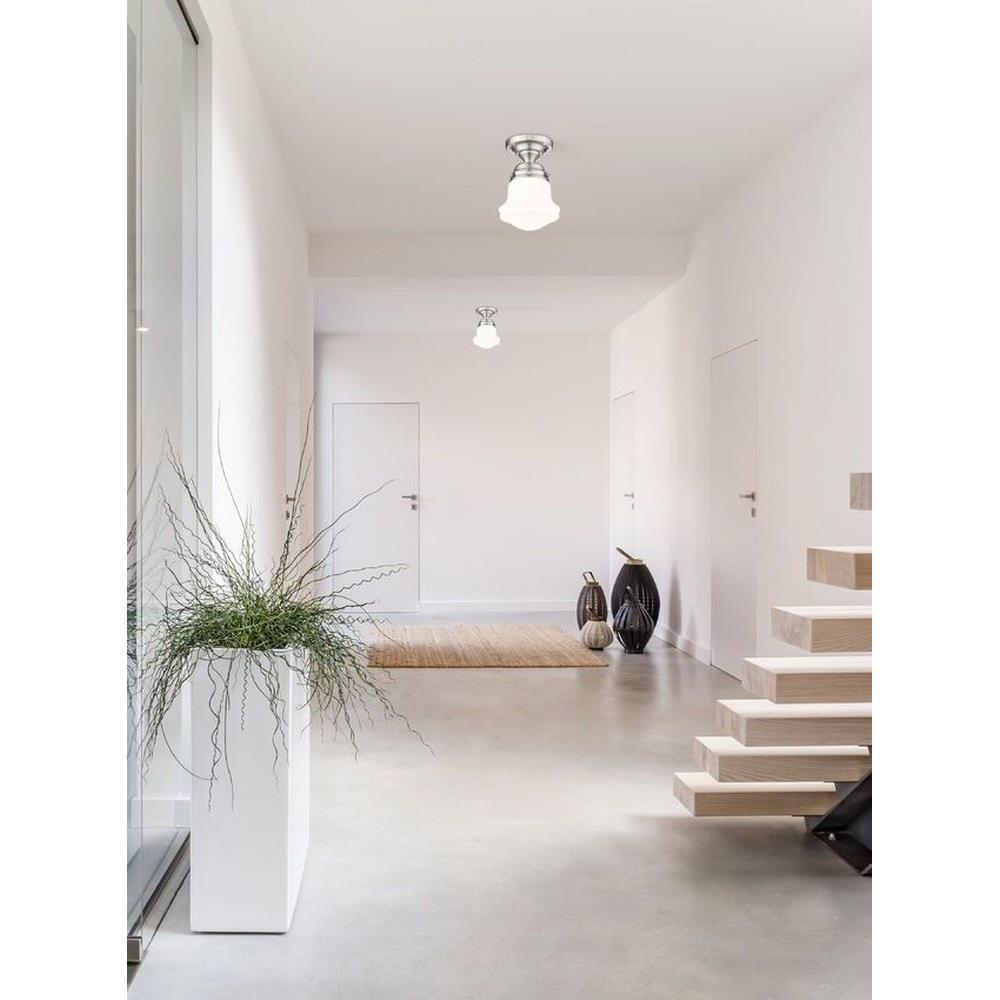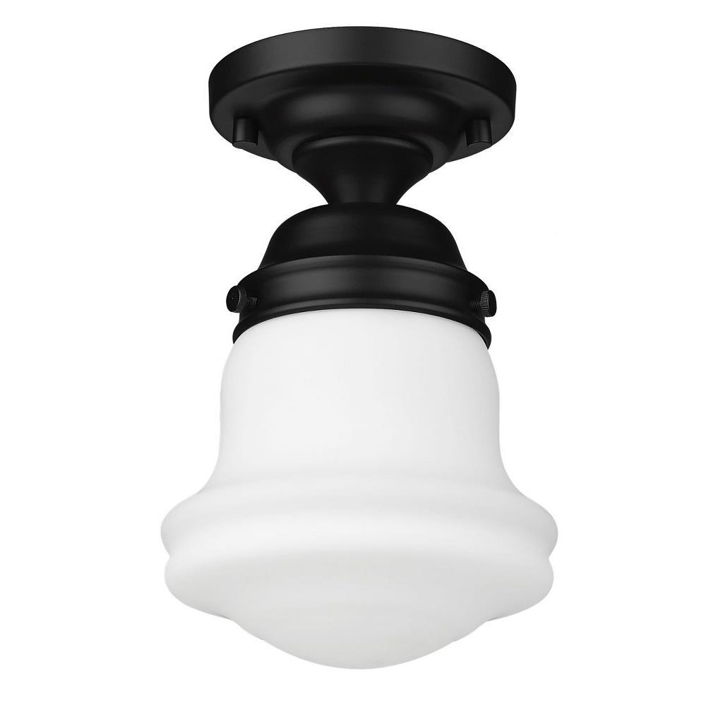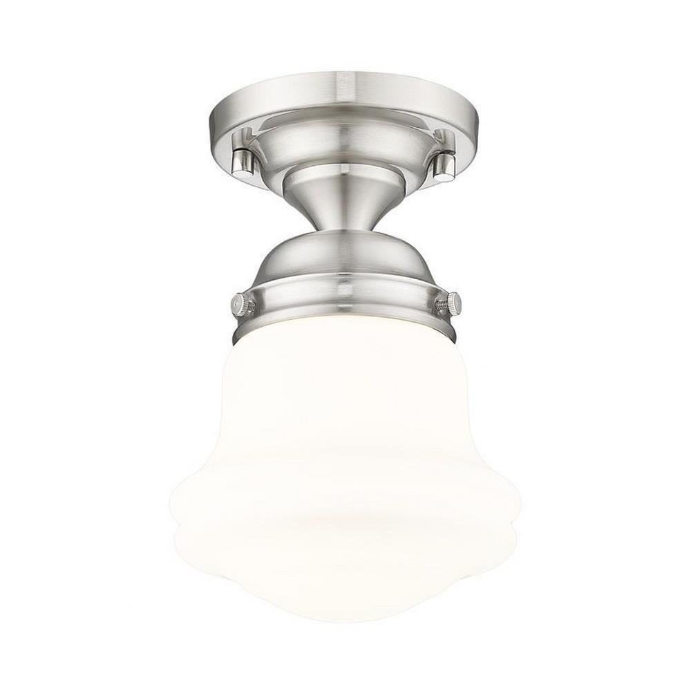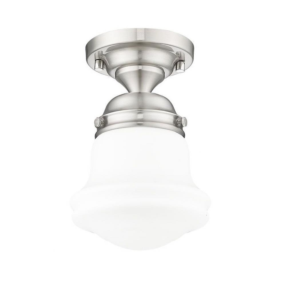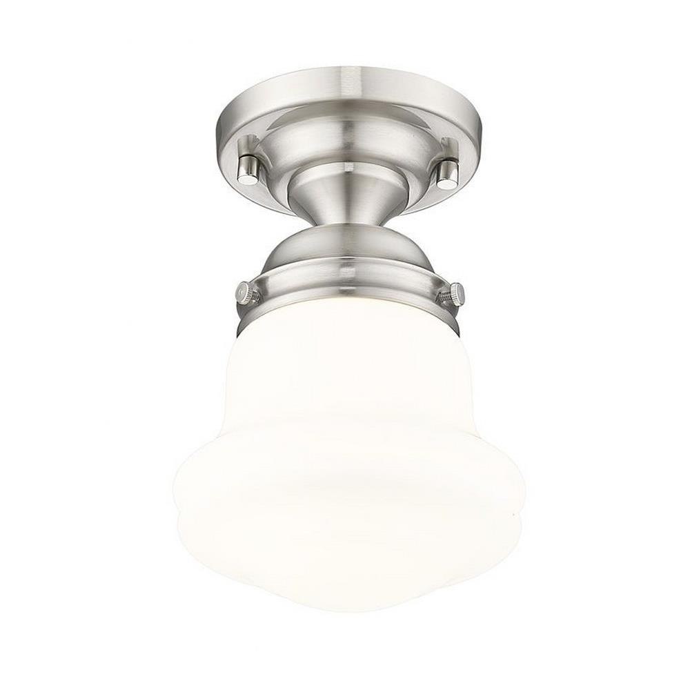 Elevate sophisticated classical interiors with the refined contoured silhouette and smooth surfaces of this petite restoration style flush mount. A small but powerful glow emits from the matte opal glass bell shade tucked within a heritage brass steel mount detailed with rivet accents that lend an industrial schoolhouse-inspired aesthetic and vintage flair. This classical single light flush mount offers a serene ambiance, illuminating foyers, hallways and compact spaces, as it offers a warm metallic touch.
