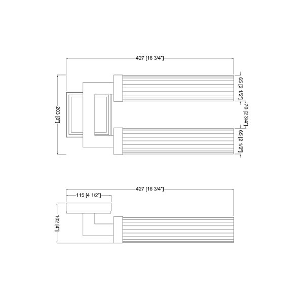 Square tube arms in a U-shaped configuration create a bold structure for this modern two-light wall sconce. A brushed nickel finish encourages contemporary aesthetics, perfect for living rooms, entries, bedrooms and dining areas. Clear ribbed glass is used for cylindrical shades, offering inviting verticality to the fixture's overall look and feel.