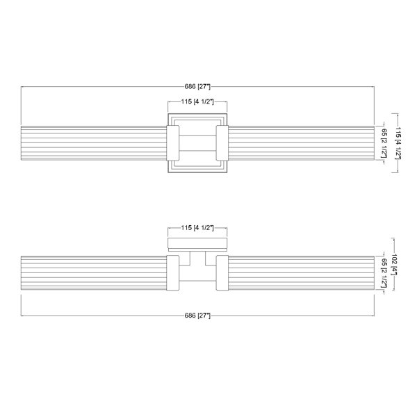 Square tube arms in a U-shaped configuration create a bold structure for this modern two-light wall sconce. A brushed nickel finish encourages contemporary aesthetics, perfect for living rooms, entries, bedrooms and dining areas. Clear ribbed glass is used for cylindrical shades, offering inviting verticality to the fixture's overall look and feel.
