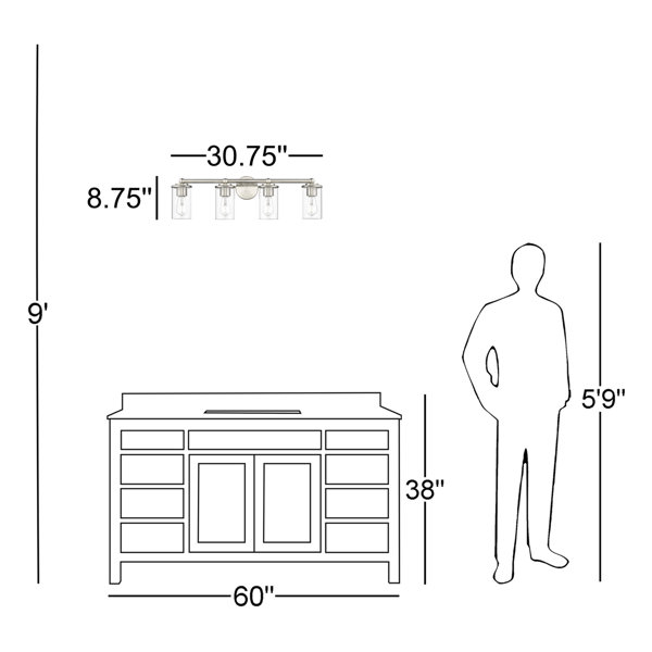 With a sleek modern appearance, this 4-light vanity fixture is ready to boldly illuminate your bathroom, powder room, or hallway. Crafted from steel with a dynamic finish, it includes a circular backplate and a horizontal bar that connects to four upward- or downward-facing holders. Attached to each one is a clear glass drum shade that surrounds a bulb (sold separately). This vanity light is compatible with dimmer switches to move you effortlessly from day to night, and it's damp-rated for safe use in high-moisture environments.