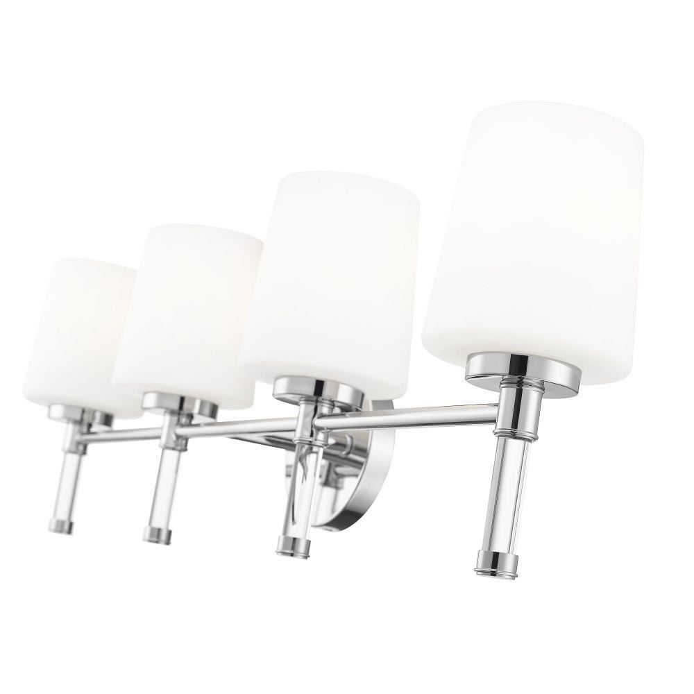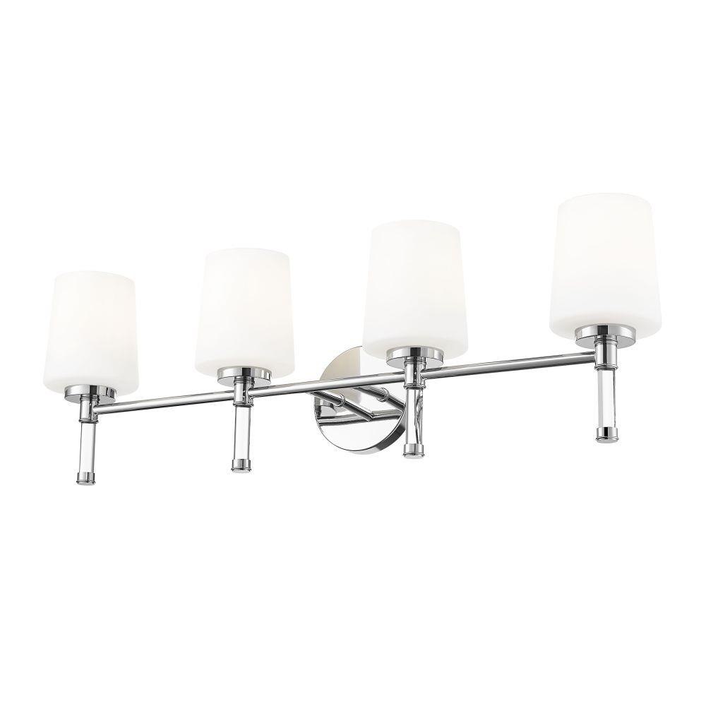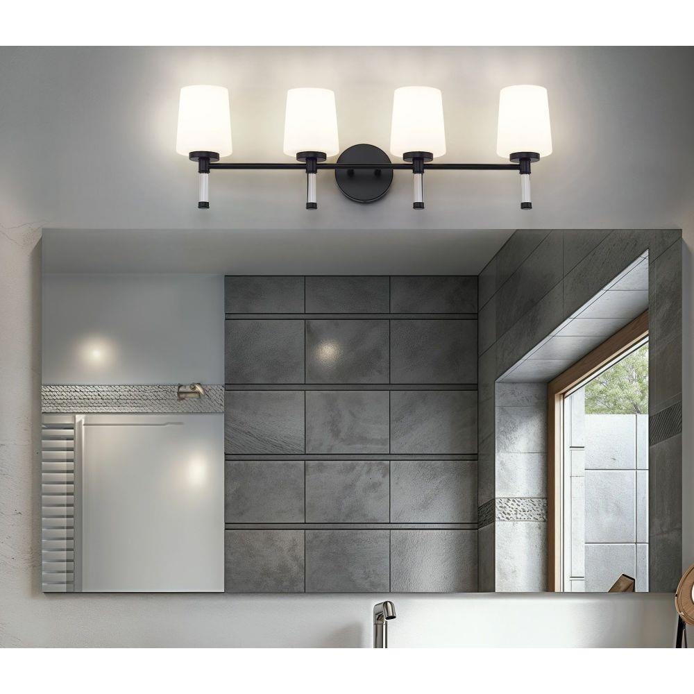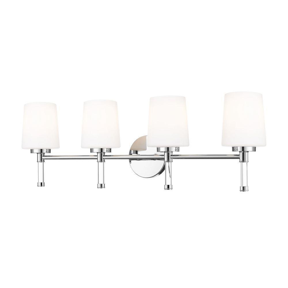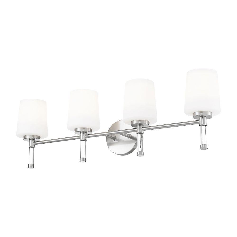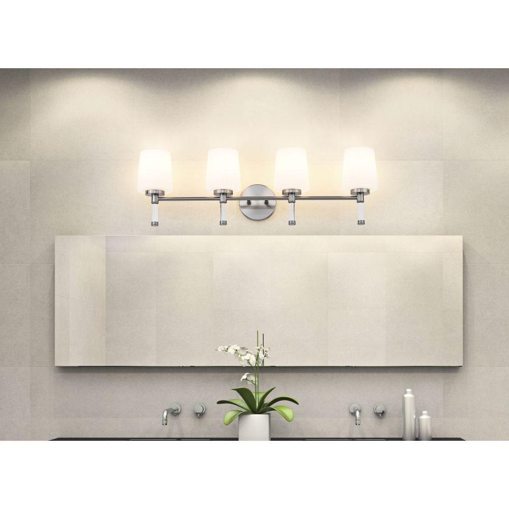 Designed for wider counters and shared spaces, this brushed nickel four-light vanity light spans the wall with an easy, horizontal line that feels calm and organized. Four opal glass shades send out generous, even illumination that helps every corner of the mirror come alive, from the farthest edge of a double sink to the center where everyone gathers. In a busy household bath or a serene primary retreat, this dependable fixture acts as a steady anchor that keeps the room feeling bright and thoughtfully finished.