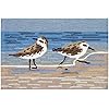 The decorative Sandpipers mat features a delightful coastal rug of playful sandpipers in the sand along the shoreline with the ocean in the distance lending a beachy feel.. The brown and white sandpipers prance in the beige sand by the blue ocean.