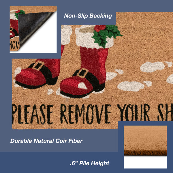 The festive mat is sure to bring a smile to your face this holiday season. Featuring our favorite jolly old elf, Santa Claus's boots. This utility mat is both charming and practical. The doormats are durable and beautiful. Coir is eco-friendly, made from natural fibers that are extracted from the outer shell of a coconut known for its strength and durability. The mats feature a durable back and a stiff, durable natural coir front perfect for wiping shoes before entering the home, keeping it tidy. Dyes saturate the fibers for long-lasting color.