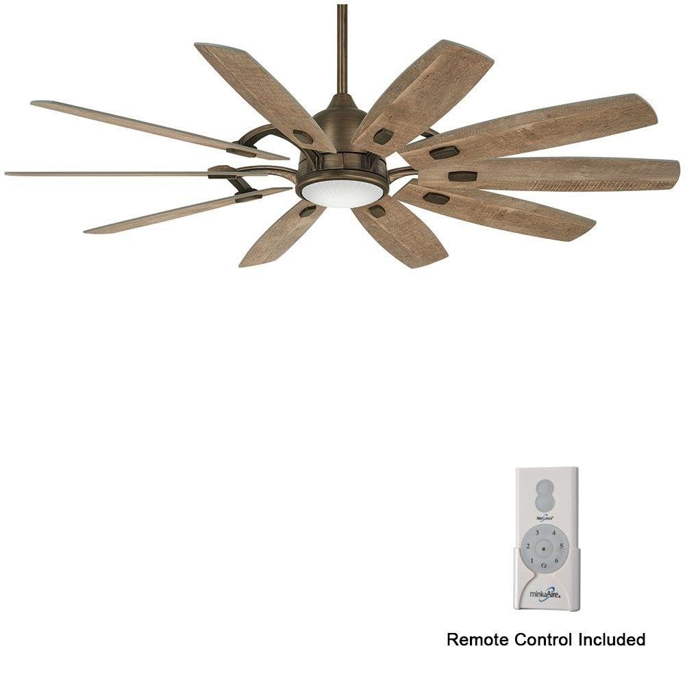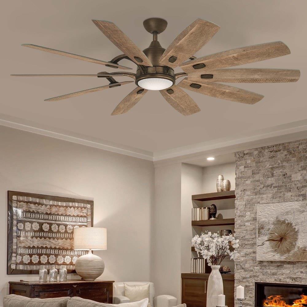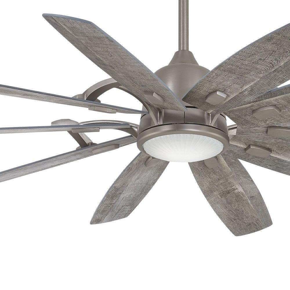 65" 10-Blade LED Ceiling Fan in a Burnished Nickel Finish with Savannah Gray Blades and Clear Ribbed Glass.